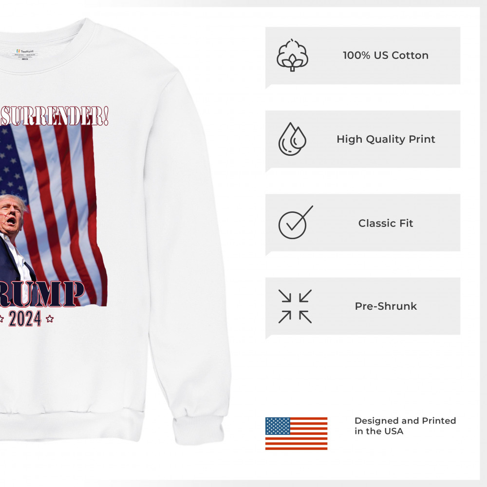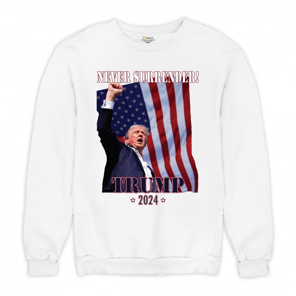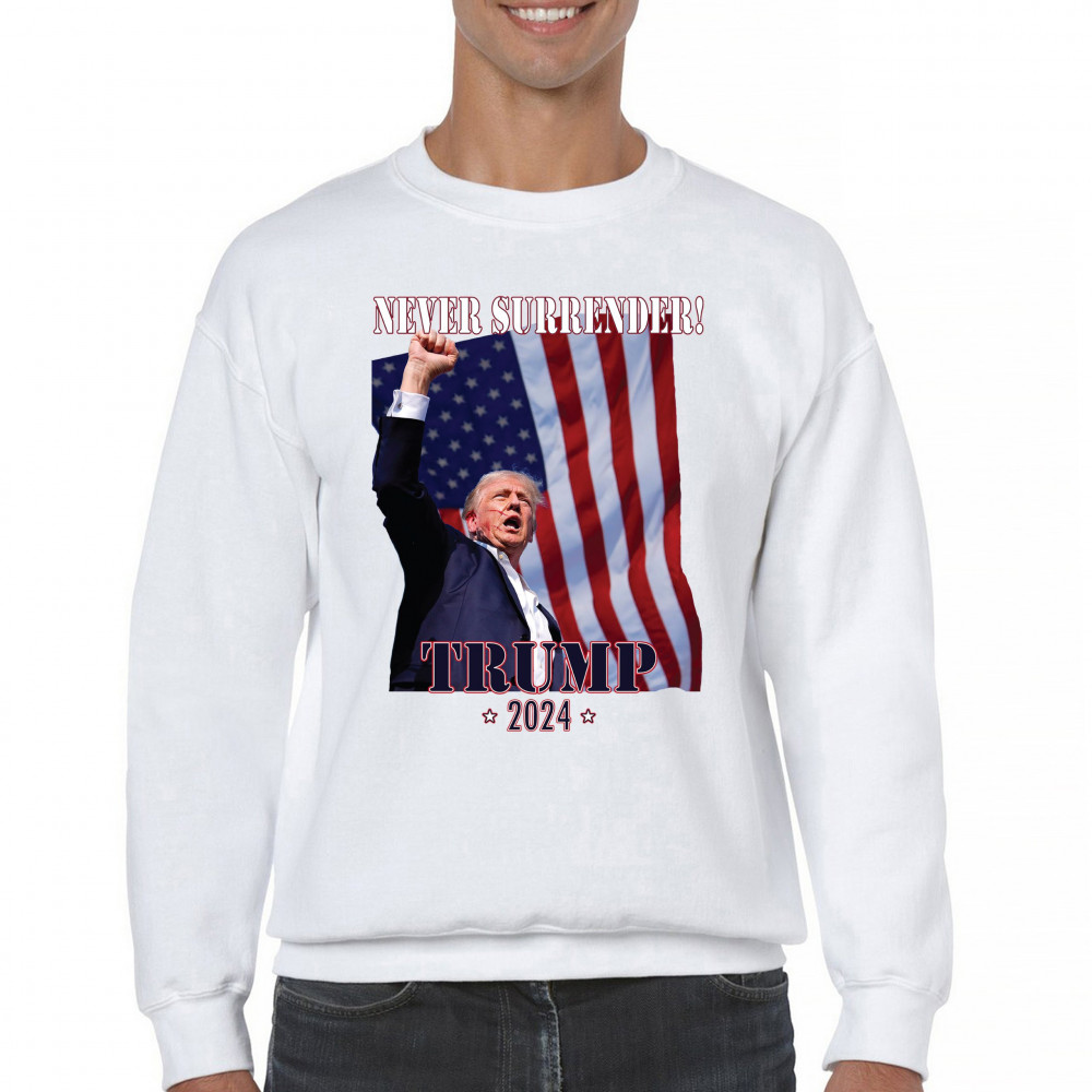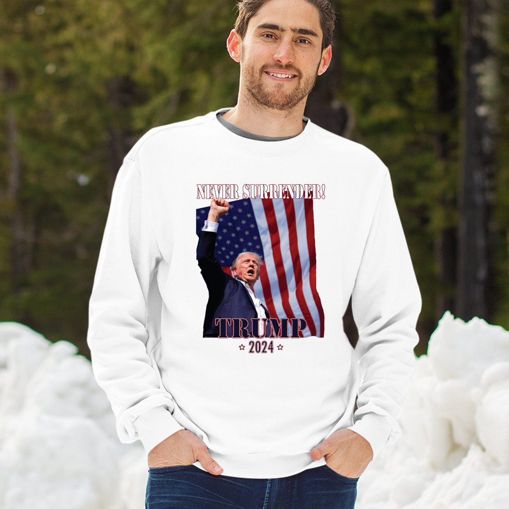 Support Donald Trump with our bold "Never Surrender! Trump 2024" design, featuring Trump against the American flag. Perfect for rallies and everyday wear.