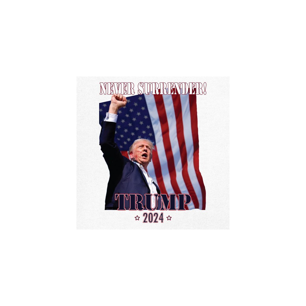 Celebrate your patriotic spirit and political stance with our "Never Surrender! Trump 2024" design. This powerful graphic showcases Donald Trump with a raised fist against the backdrop of the American flag, symbolizing resilience and determination. Ideal for rallies, events, and everyday wear, this design is crafted from premium materials for comfort and durability. Stand out and show your support for America's future with this striking and bold statement piece, perfect for any proud Trump supporter.