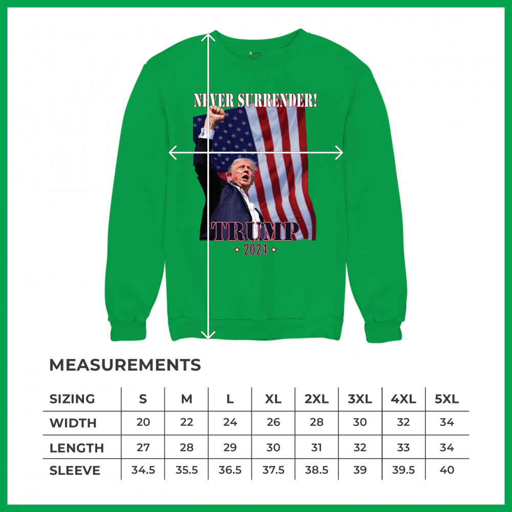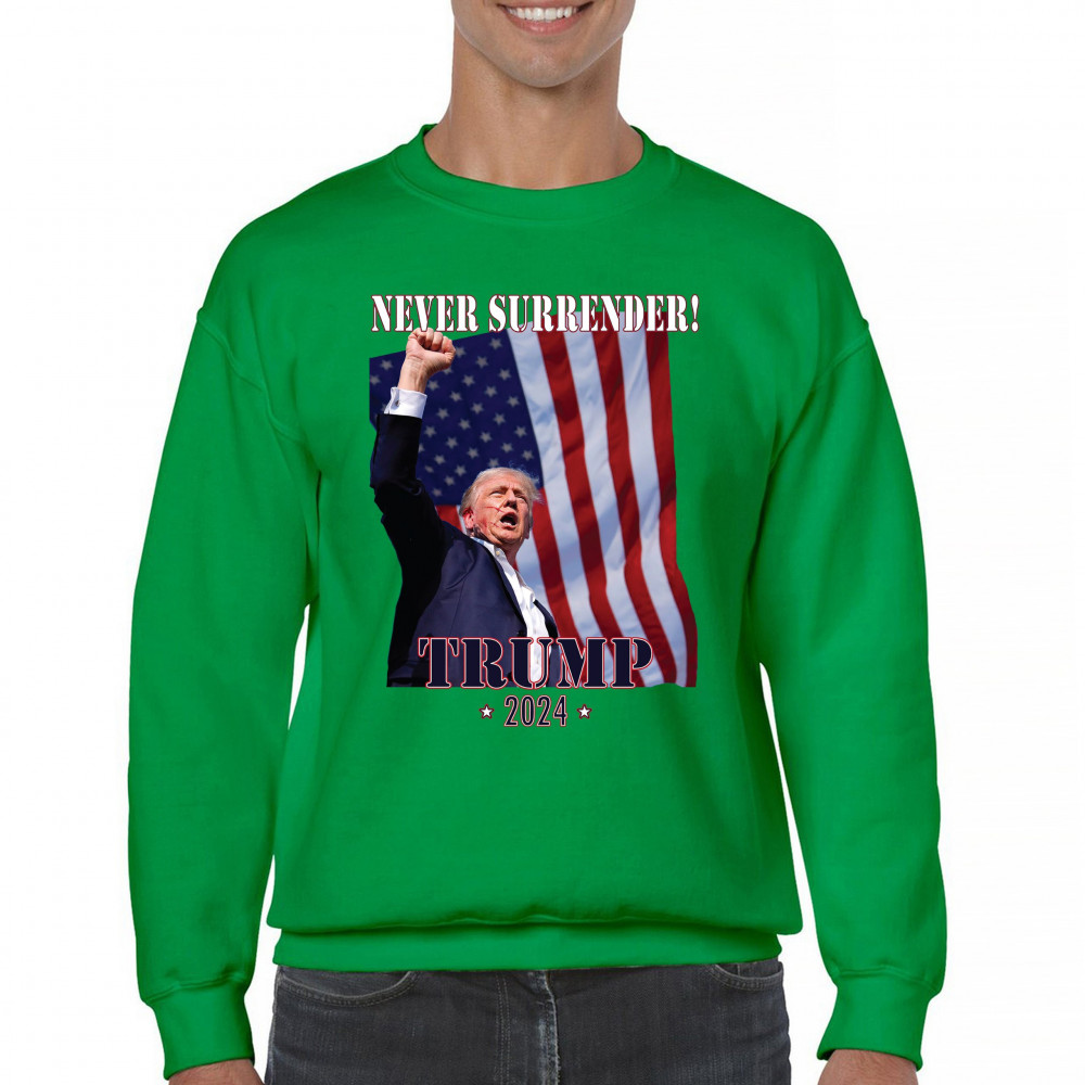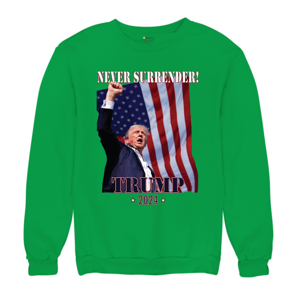 Support Donald Trump with our bold "Never Surrender! Trump 2024" design, featuring Trump against the American flag. Perfect for rallies and everyday wear.
