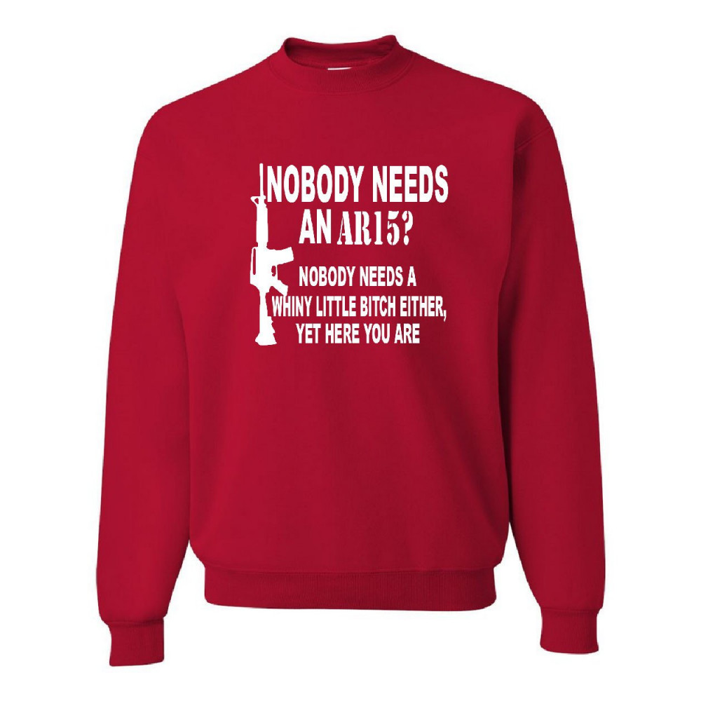 NOBODY NEEDS AN AR15? crew neck sweatshirt funny offensive humor political firearms gun rights sweatshirt red