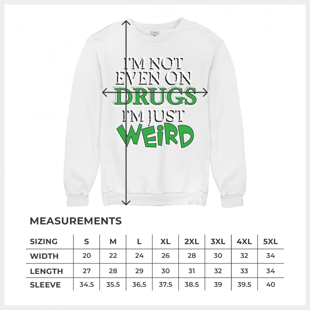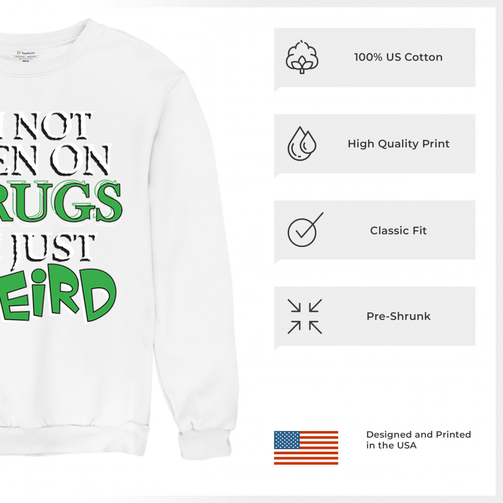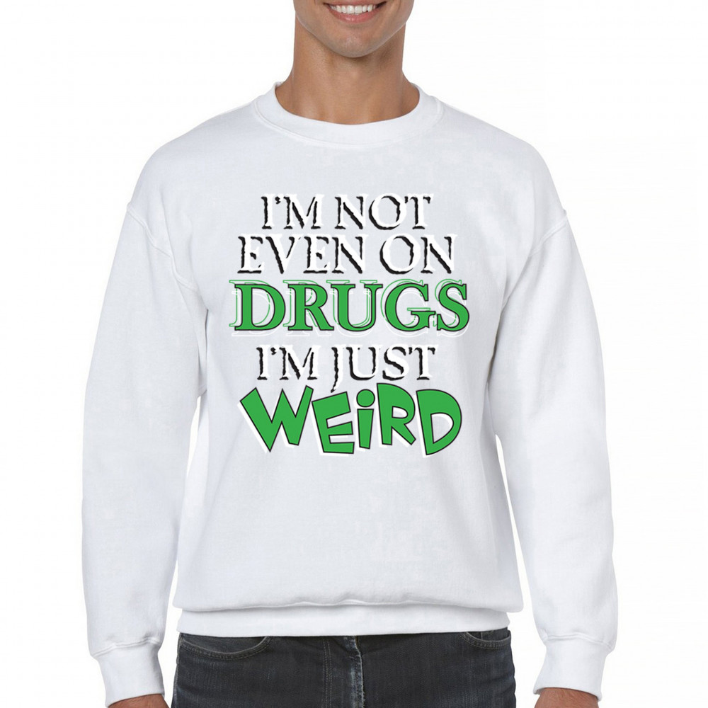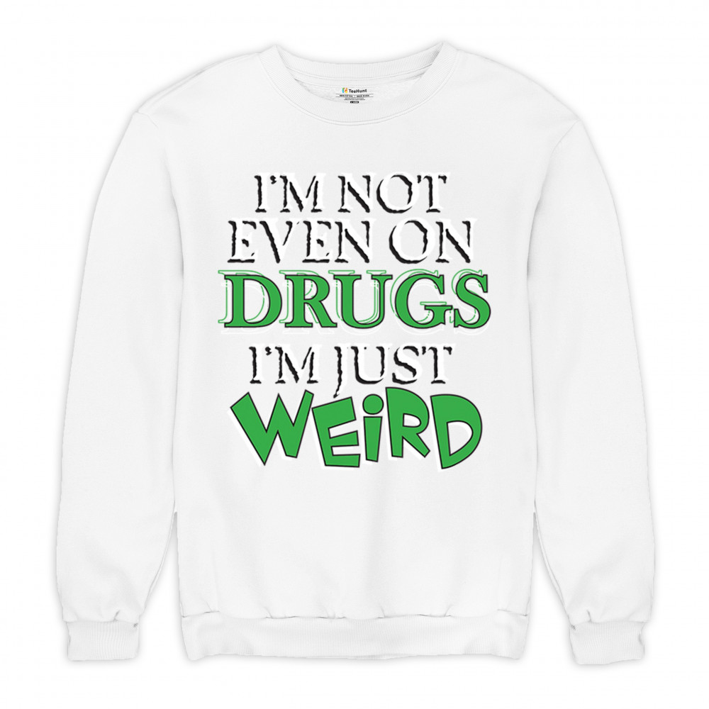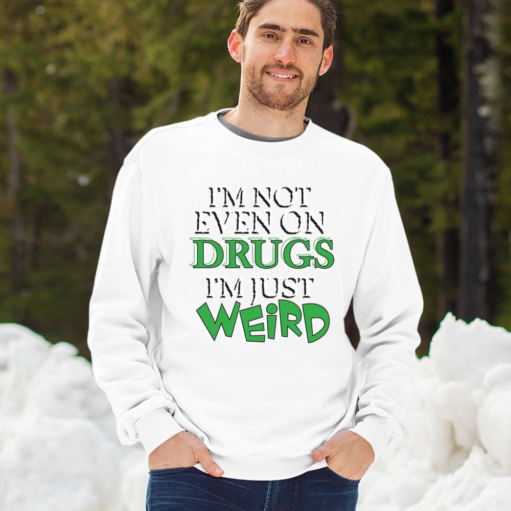 Bold weird design for introverts and quirky minds. Says “I'm not even on drugs I'm just weirdâ€â€”perfect for awkward humor and loud energy.