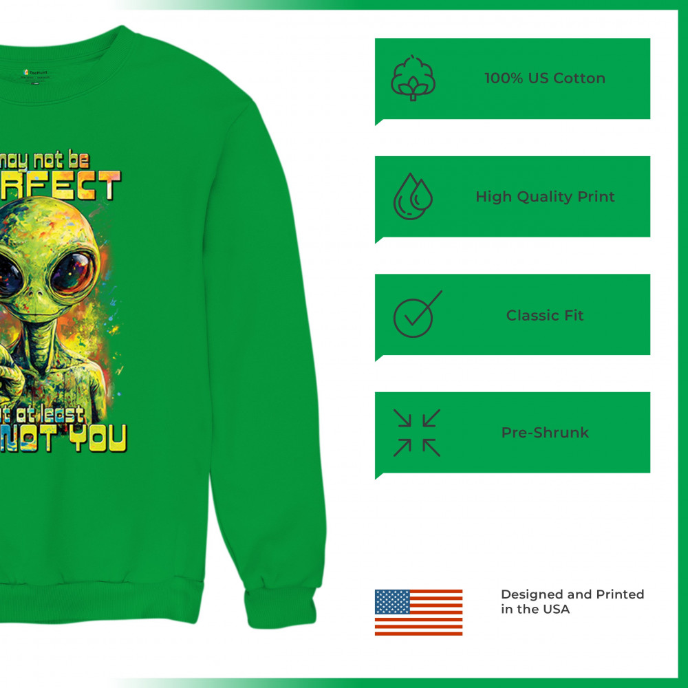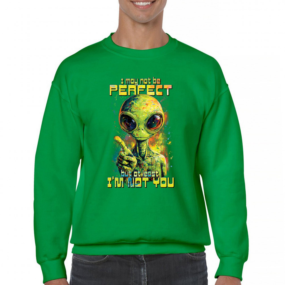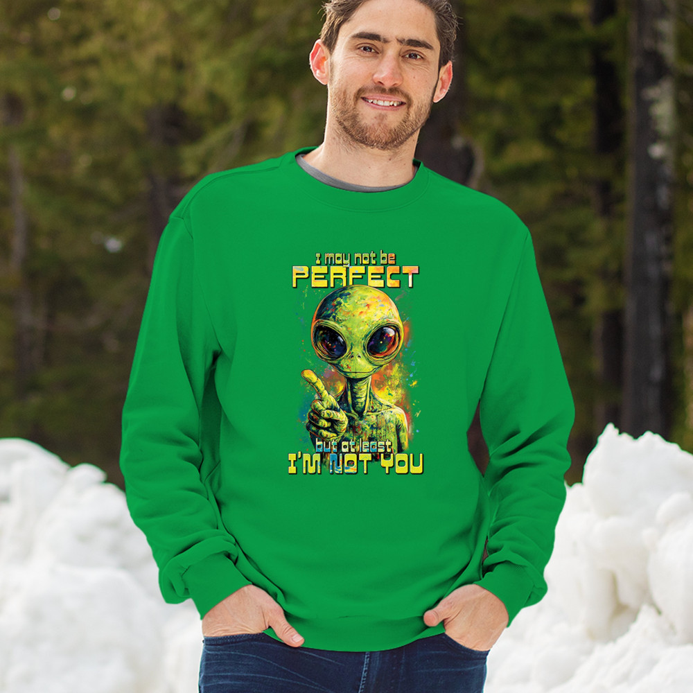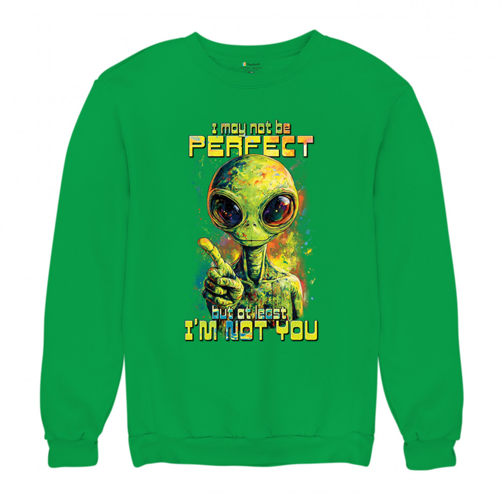 This smug alien design delivers sharp sarcastic humor with vibrant cosmic flair. Featuring a big-eyed extraterrestrial and the quote “I may not be perfect, but at least I’m not you,†it’s perfect for sci-fi fans, alien lovers, jokesters, and oddballs alike. A bold, funny statement for parties, UFO events, and festivals.