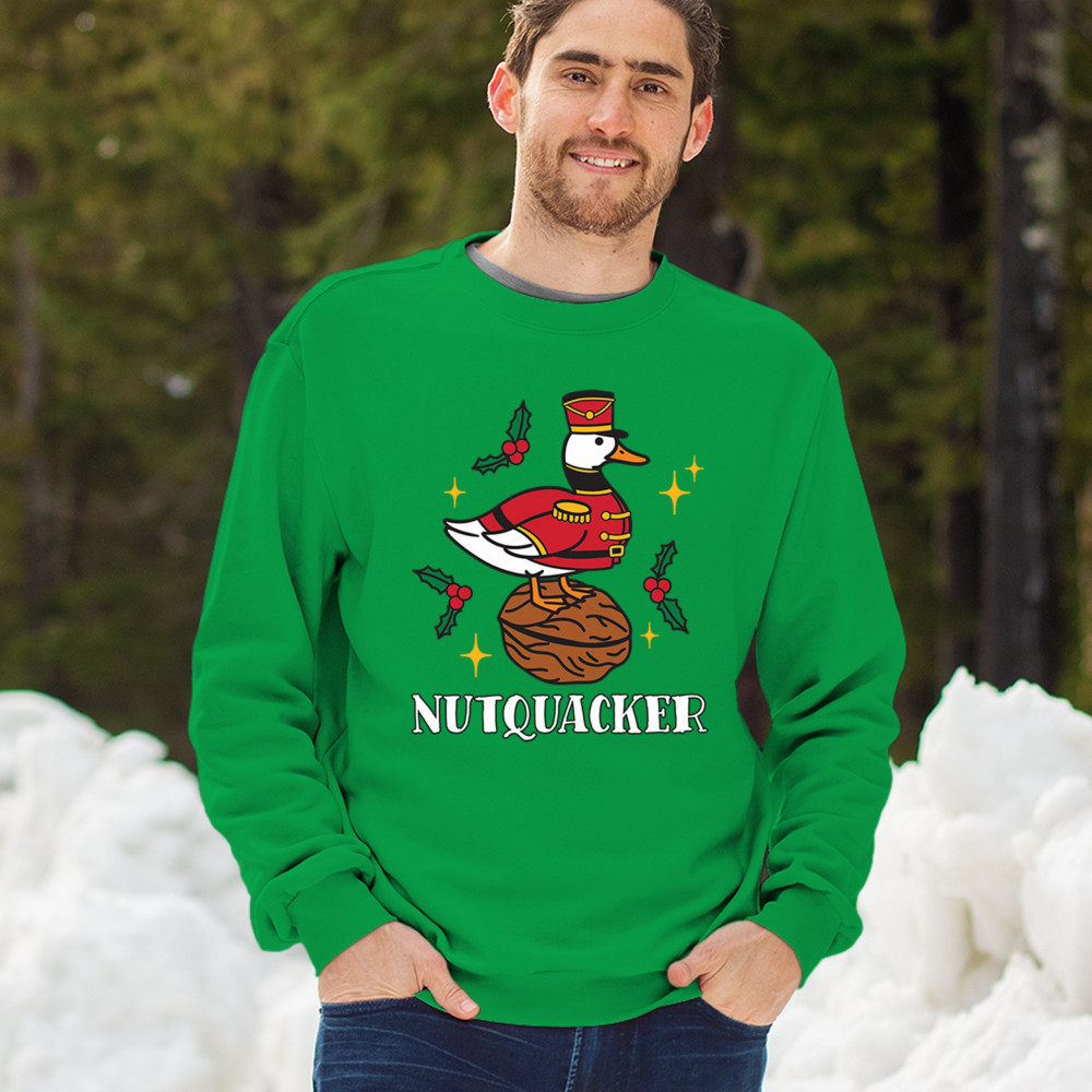 This hilarious Nutquacker design puts a festive spin on holiday humor, showcasing a duck dressed as a nutcracker standing on a walnut with holly accents and bright Christmas touches. A perfect choice for quirky gift-givers, holiday party outfits, and anyone who loves clever Christmas graphics that add personality, charm, and seasonal fun to their celebrations.