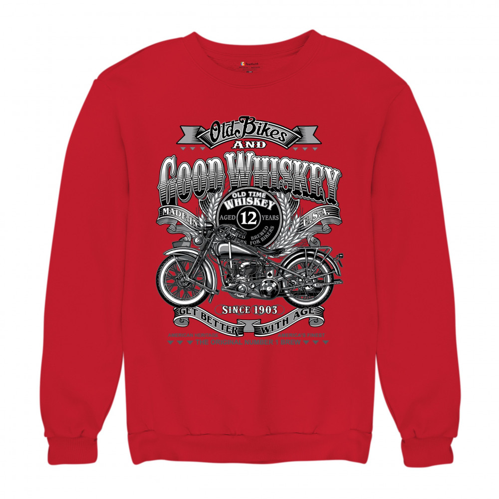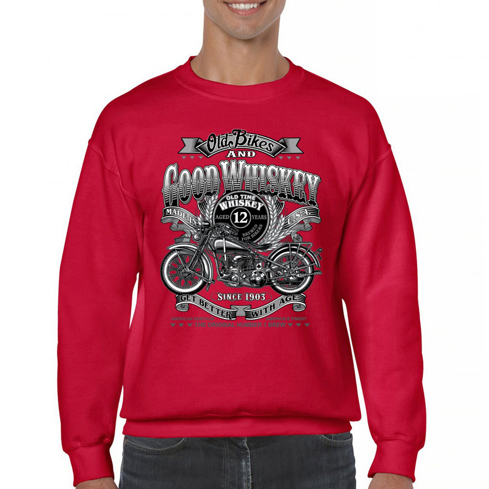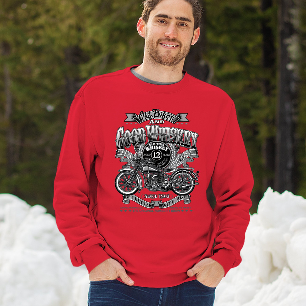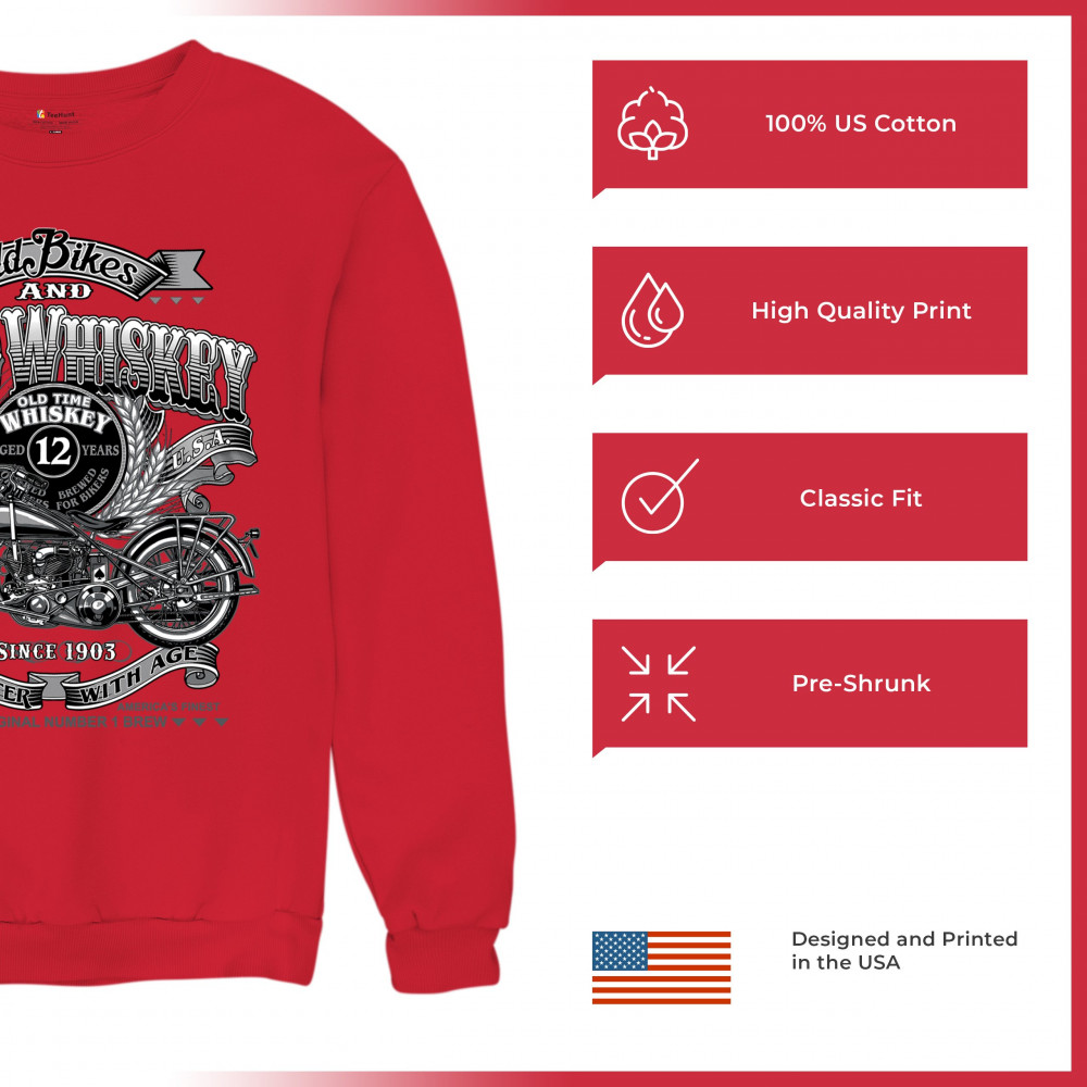 Vintage design with old bike, 12-year whiskey label, and 1903 tribute—perfect for bikers who ride hard and sip slow.