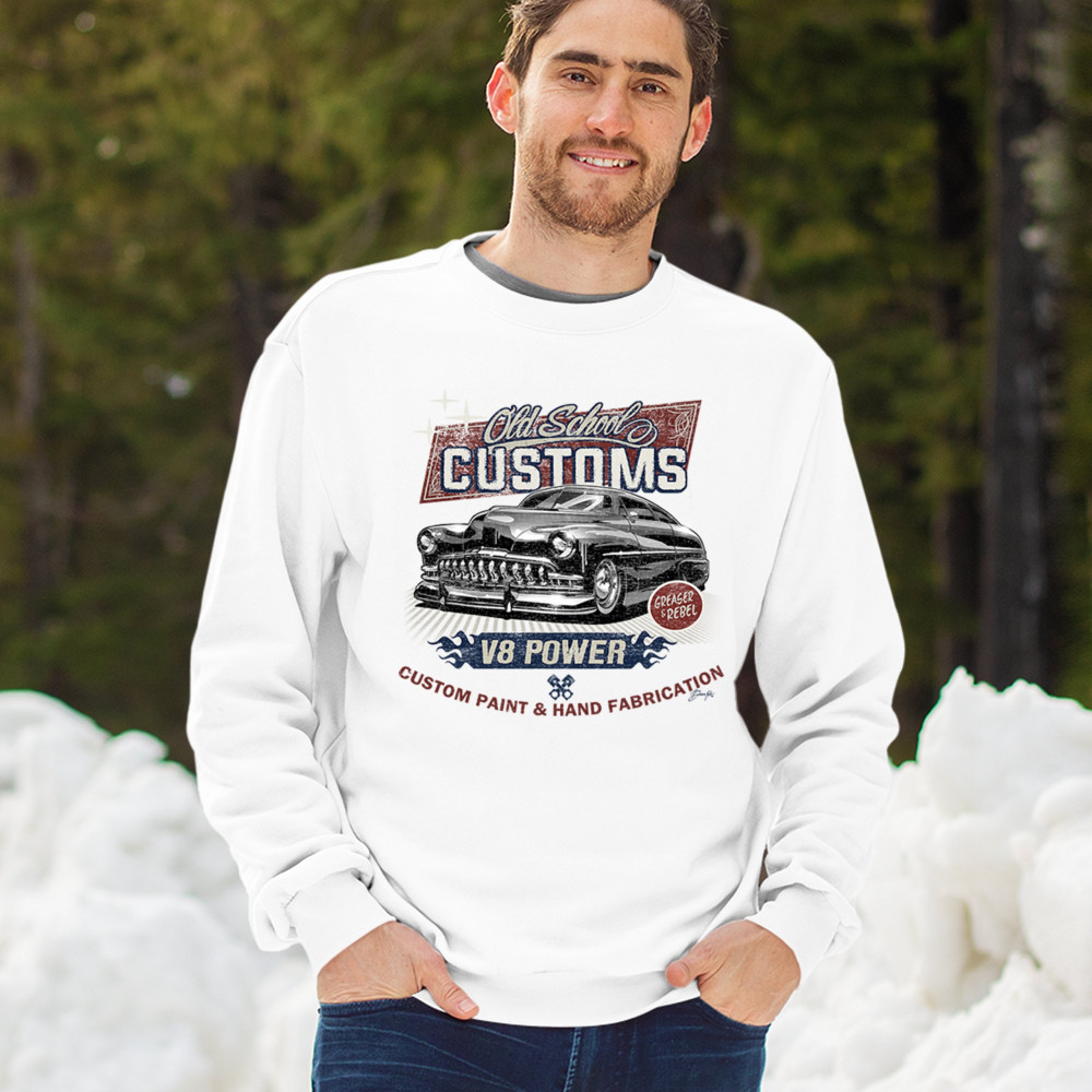 Celebrate classic automotive culture with our "Old School Customs" t-shirt, featuring a V8 power design. Perfect for car enthusiasts and fans of vintage rides.