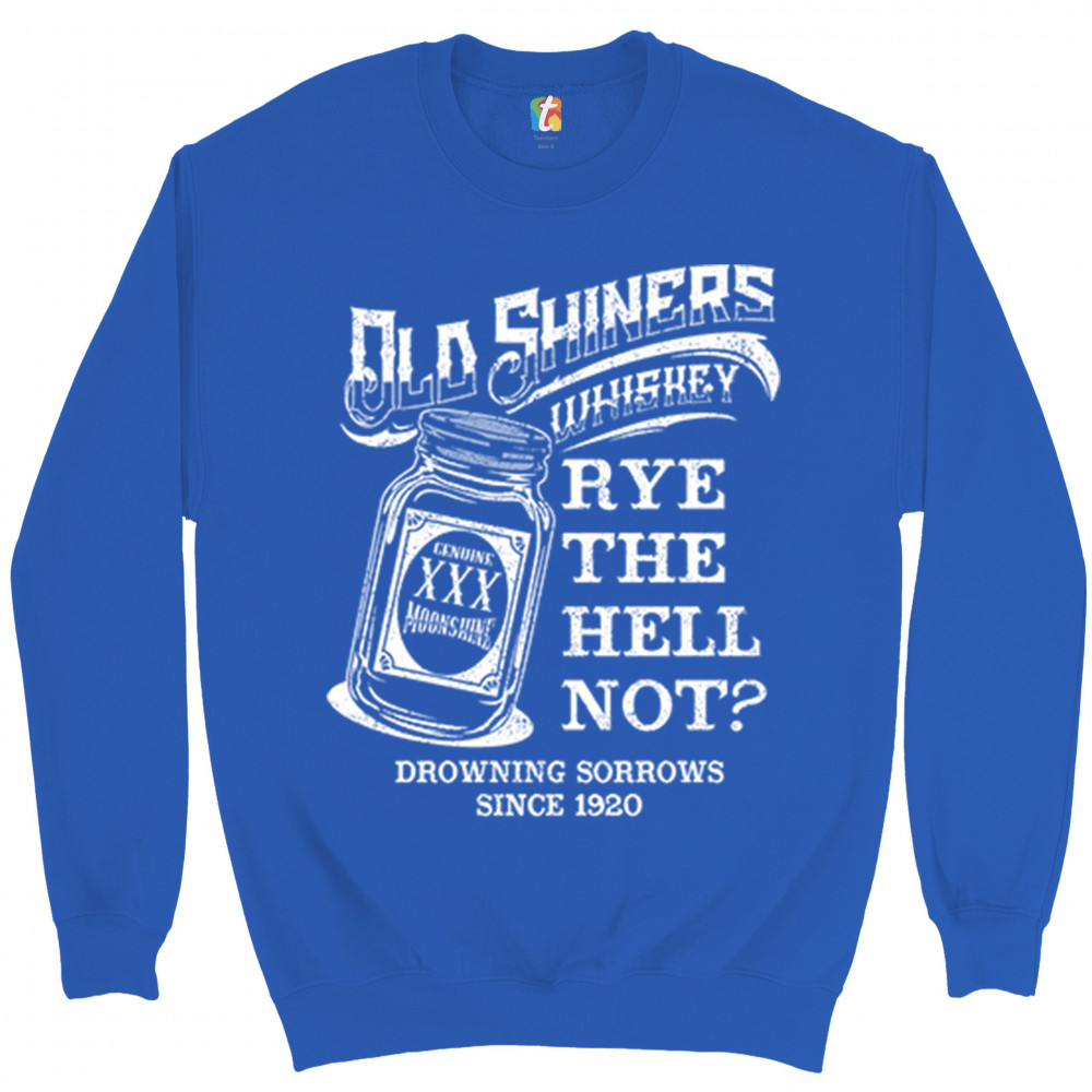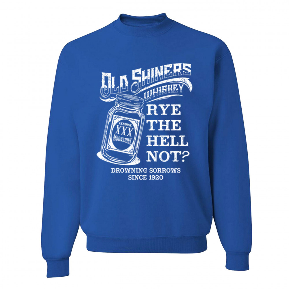 OLD SHINERS WHISKEY sweatshirt rye the hell not? old school drinking crewneck royal blue
