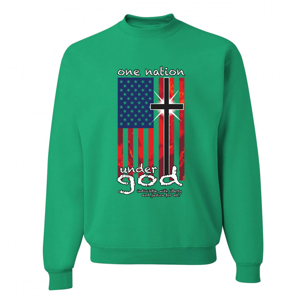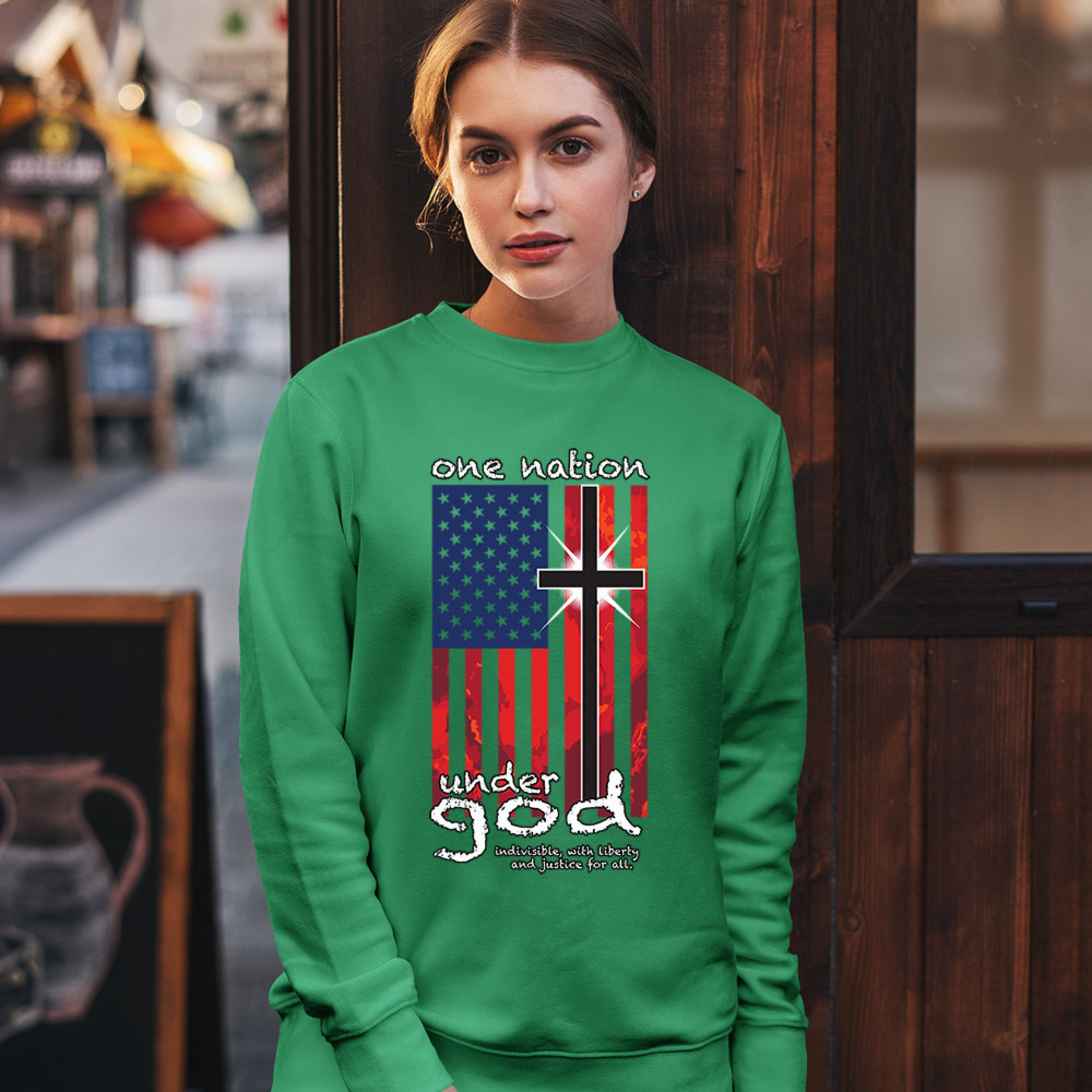 A patriotic print saying "One Nation Under God Indivisible, with Liberty and Justice for All" and featuring an American Flag with a cross instead of one of the stripes. Great choice for a religious person to wear on Independence Day or any other patriotic