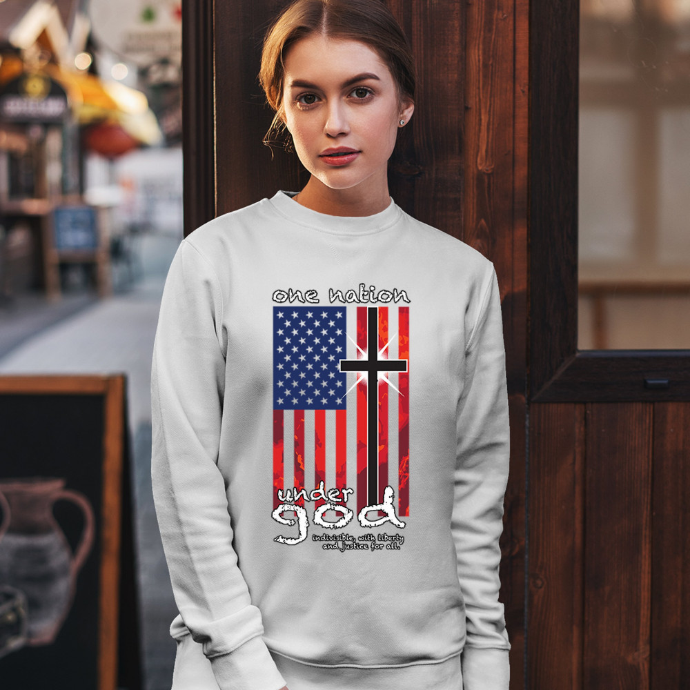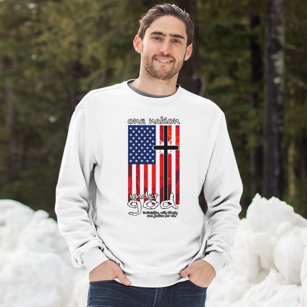 A patriotic print saying "One Nation Under God Indivisible, with Liberty and Justice for All" and featuring an American Flag with a cross instead of one of the stripes. Great choice for a religious person to wear on Independence Day or any other patriotic