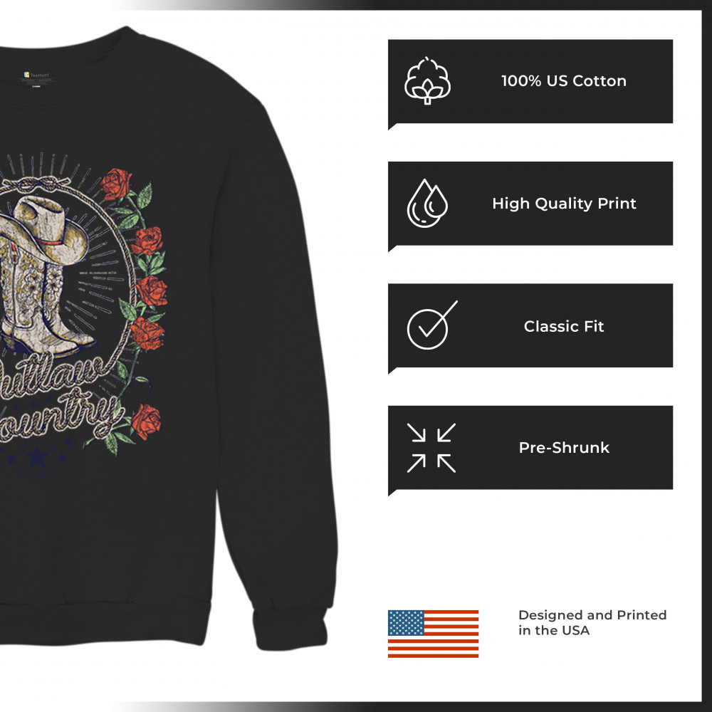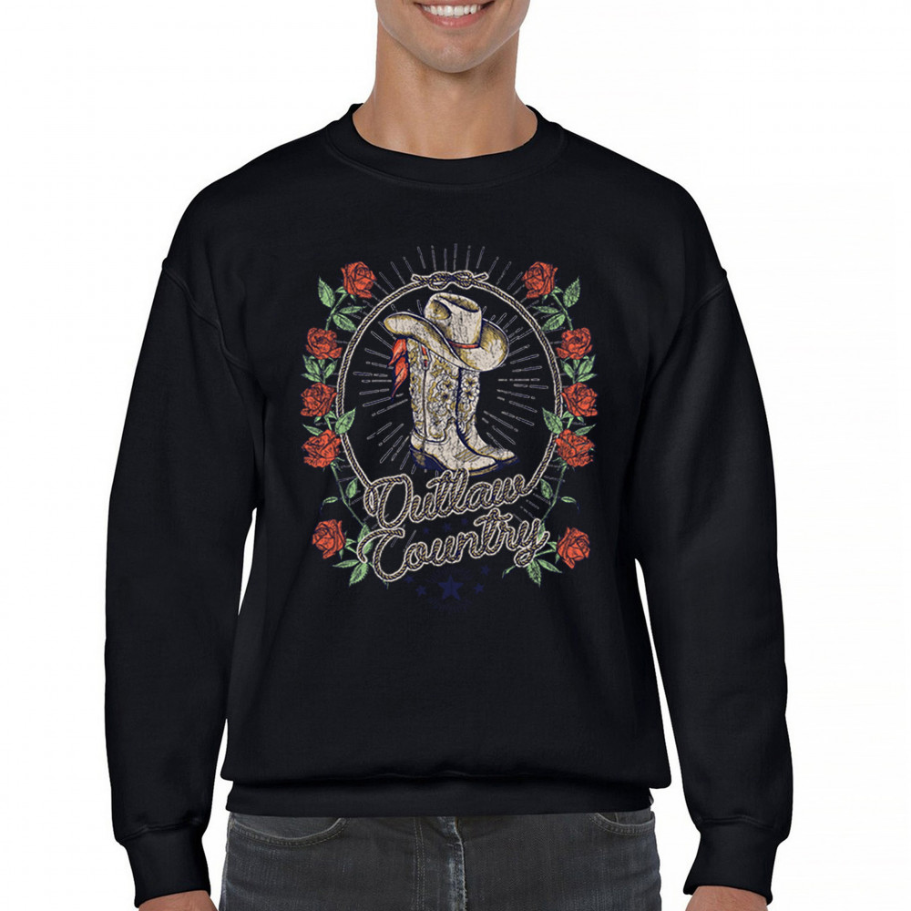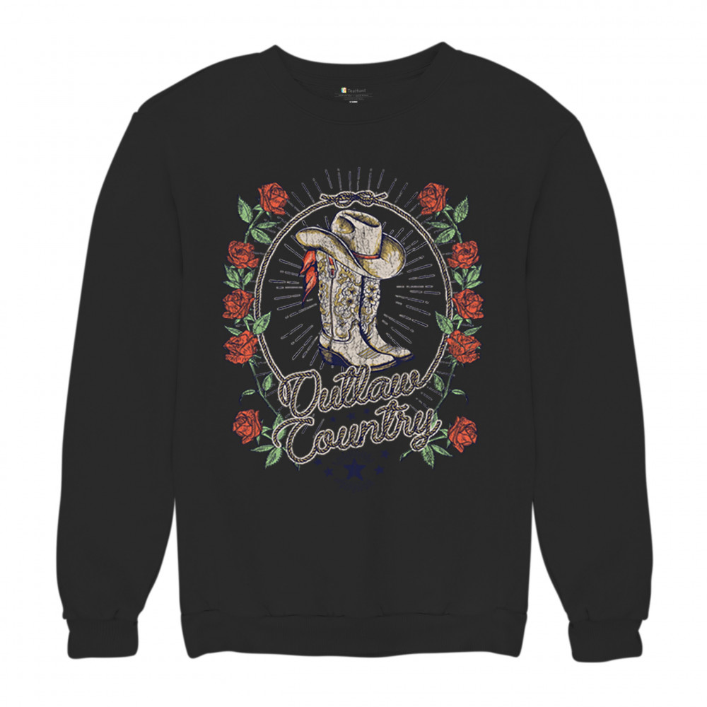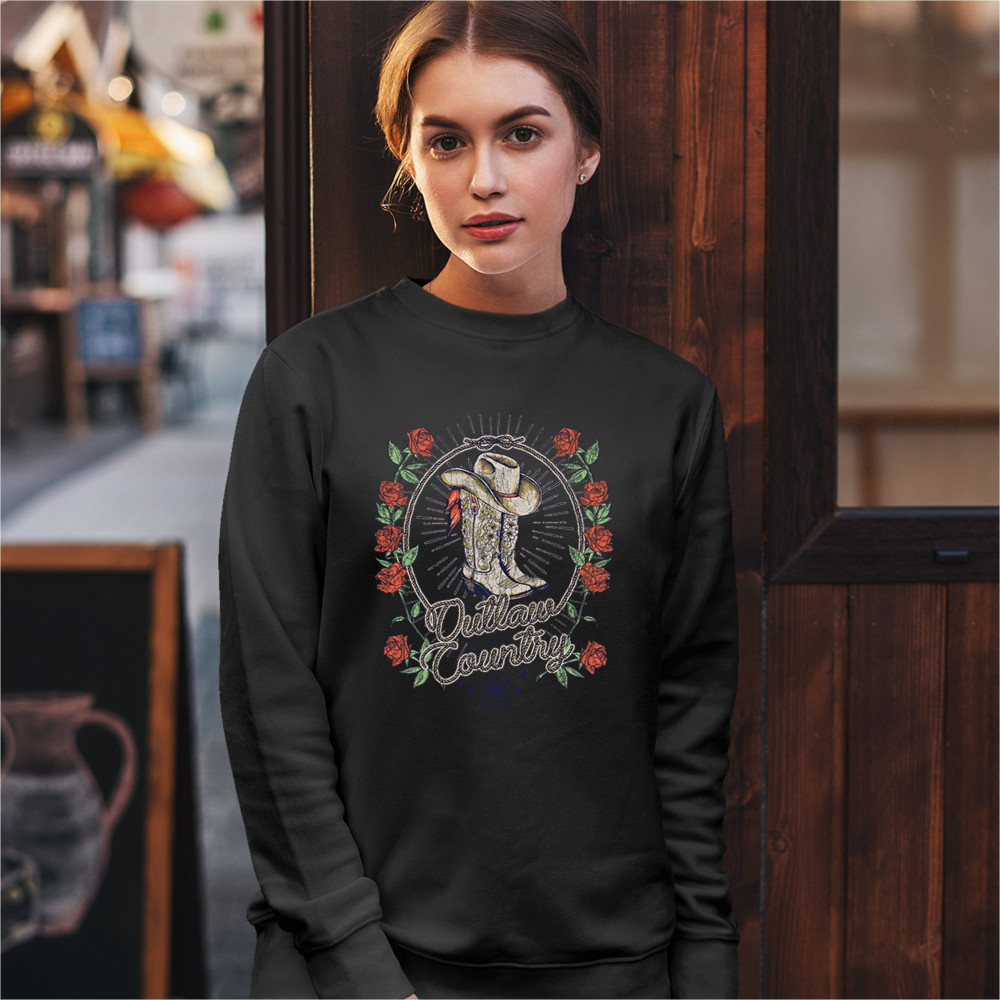 Outlaw country design with cowgirl boots, hat, and roses. Bold feminine western style for concerts, rodeos, and southern lifestyle lovers.