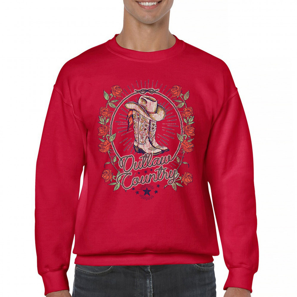 Outlaw country design with cowgirl boots, hat, and roses. Bold feminine western style for concerts, rodeos, and southern lifestyle lovers.