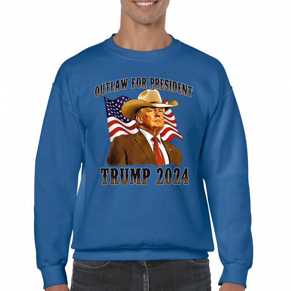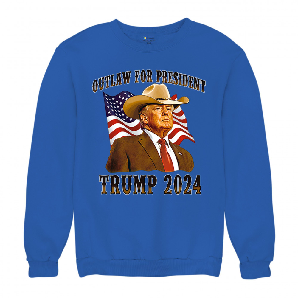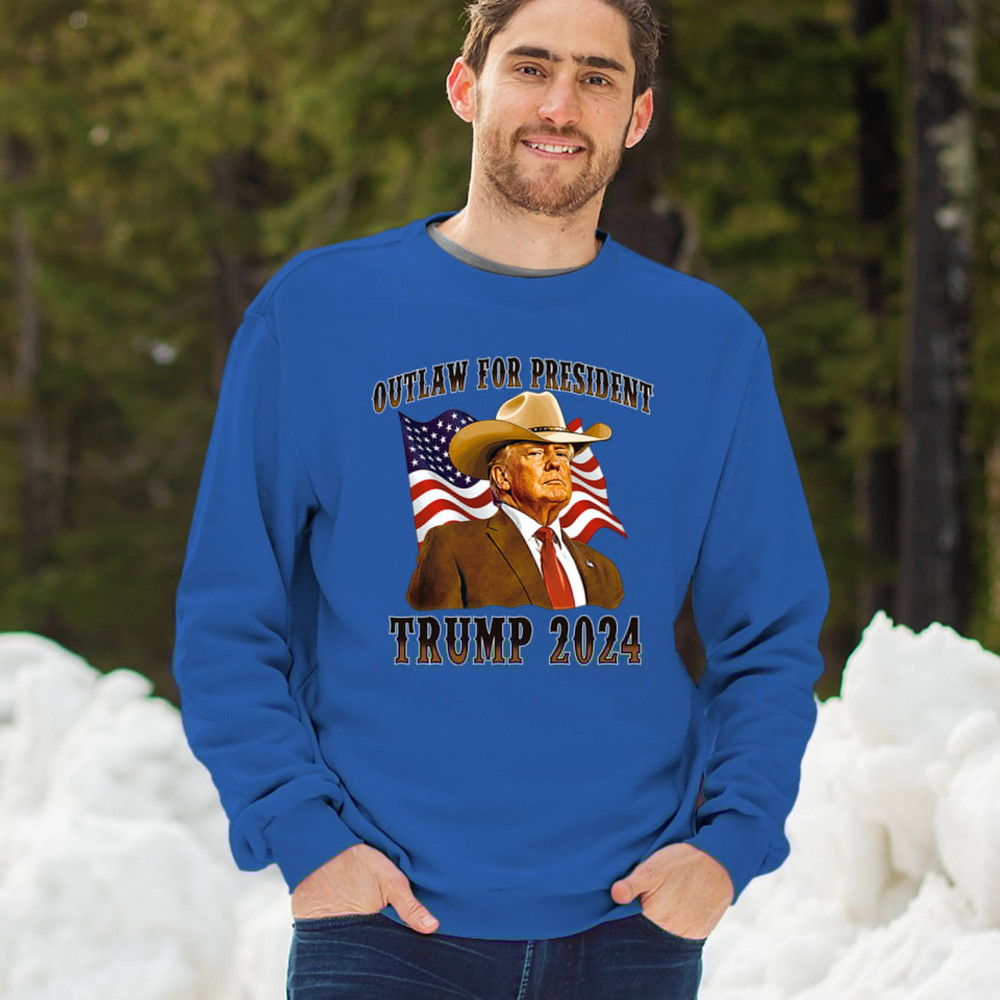 The "Outlaw for President" Trump 2024 design is a powerful symbol of American resilience and conservative pride. Featuring Donald J. Trump in a cowboy hat with the American flag waving behind, this design speaks to supporters who believe in the America First movement, conservative values, and a rebel spirit. Ideal for rallies, patriotic events, and anyone looking to make a bold statement for the 47th President of the United States.