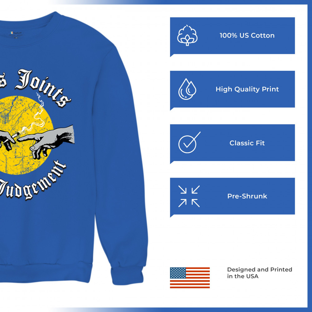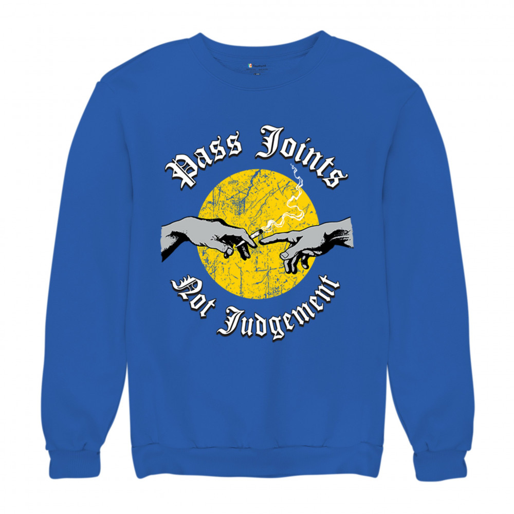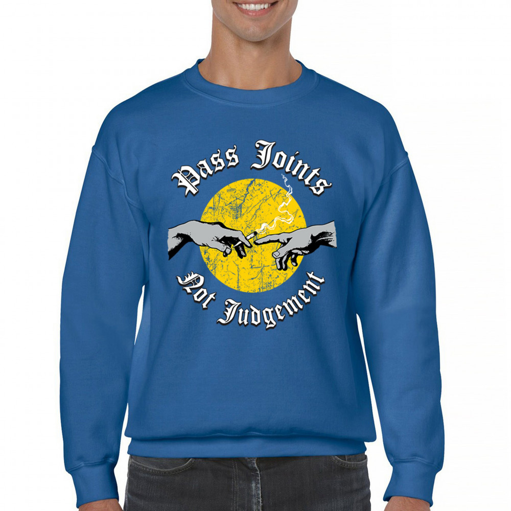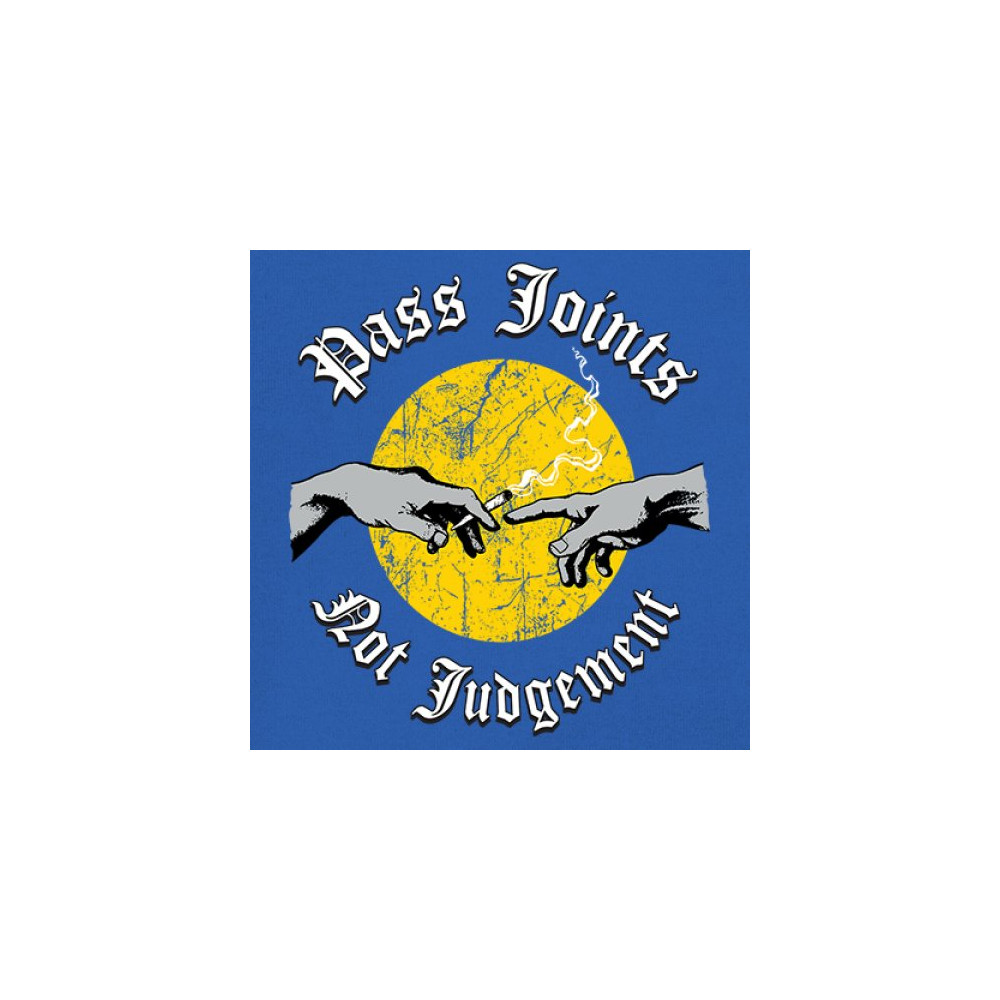 Cannabis culture twist on classic art. Hands passing a joint with “Pass Joints Not Judgement†message. Chill, bold, and unapologetically stoner.
