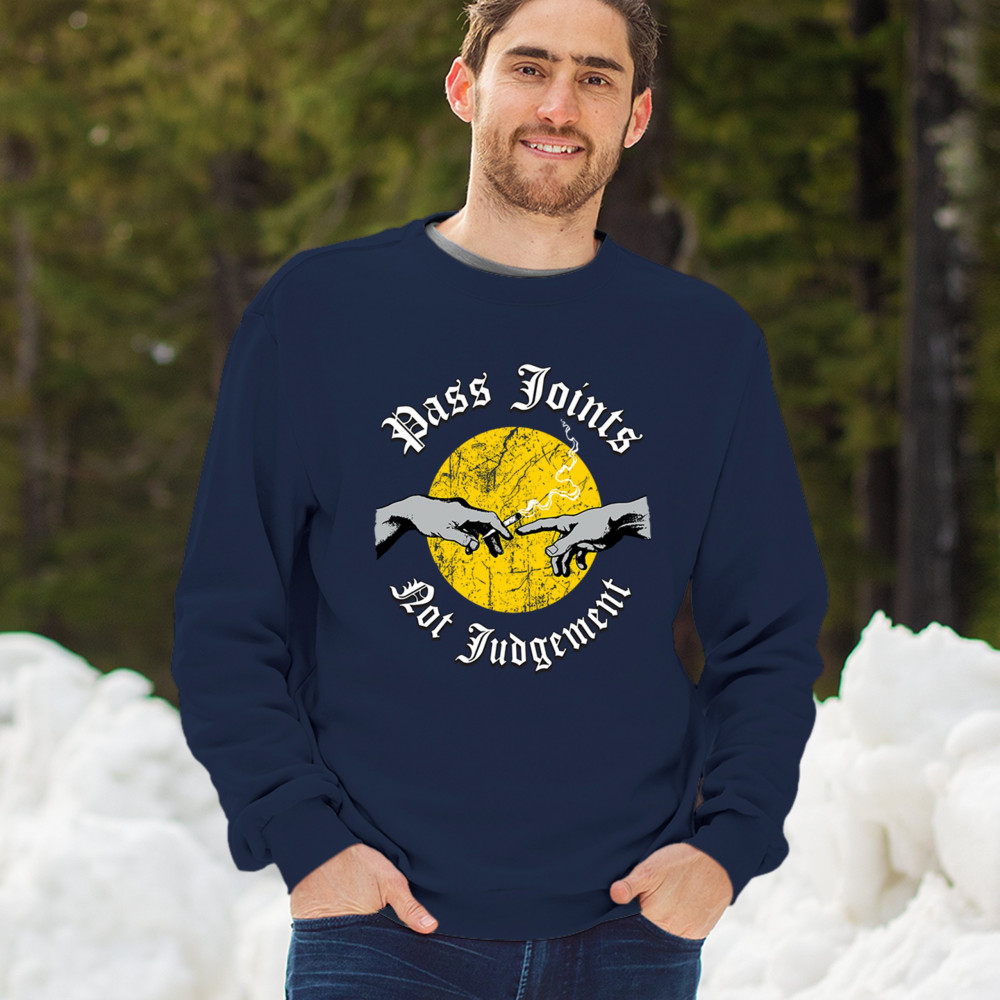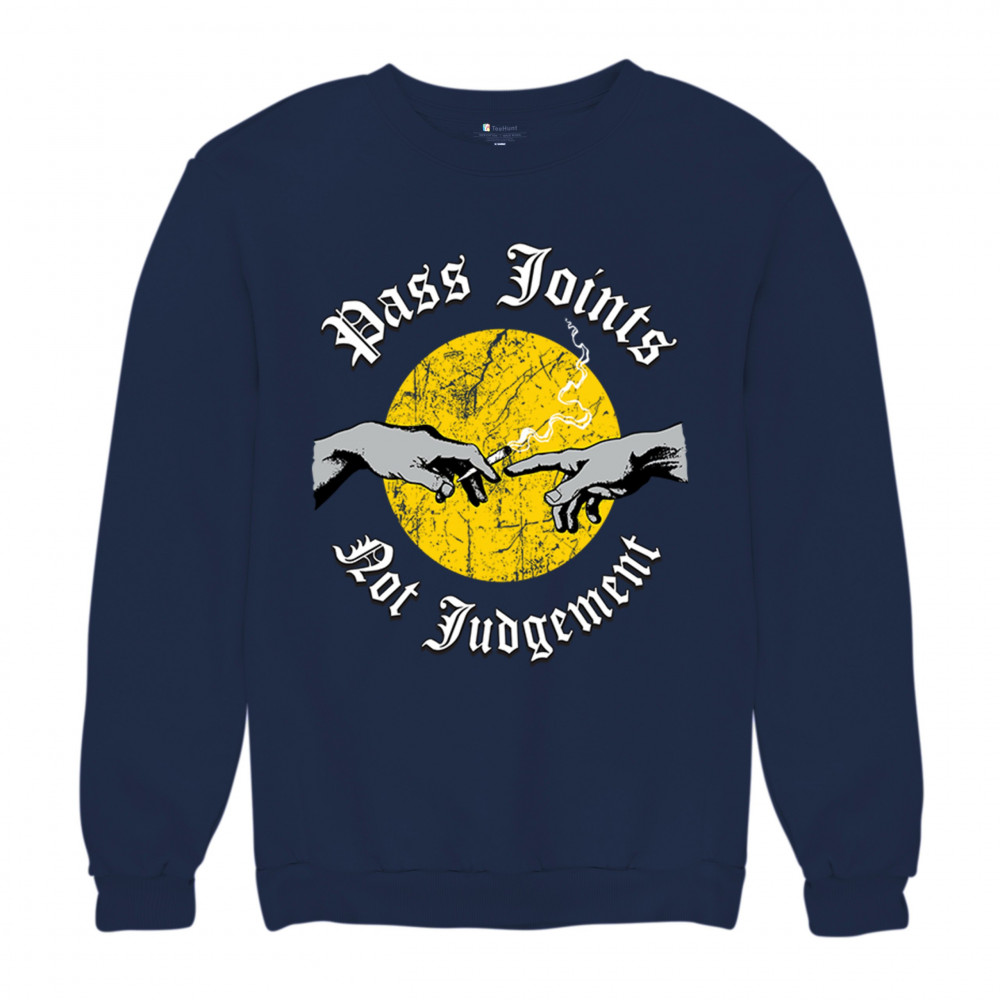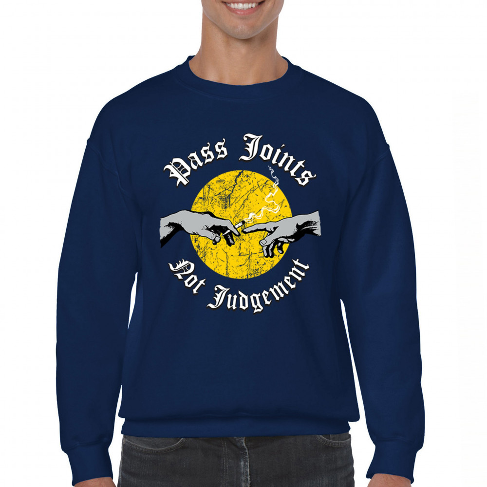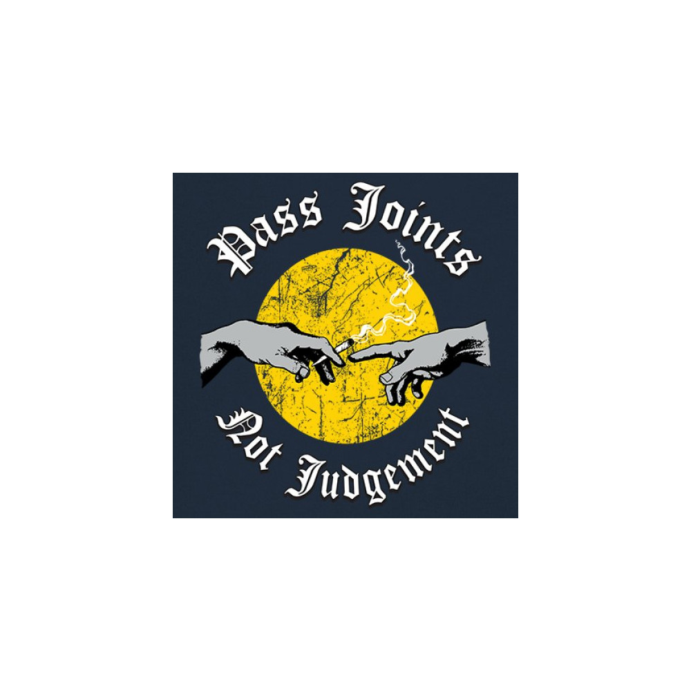 Cannabis culture twist on classic art. Hands passing a joint with “Pass Joints Not Judgement†message. Chill, bold, and unapologetically stoner.