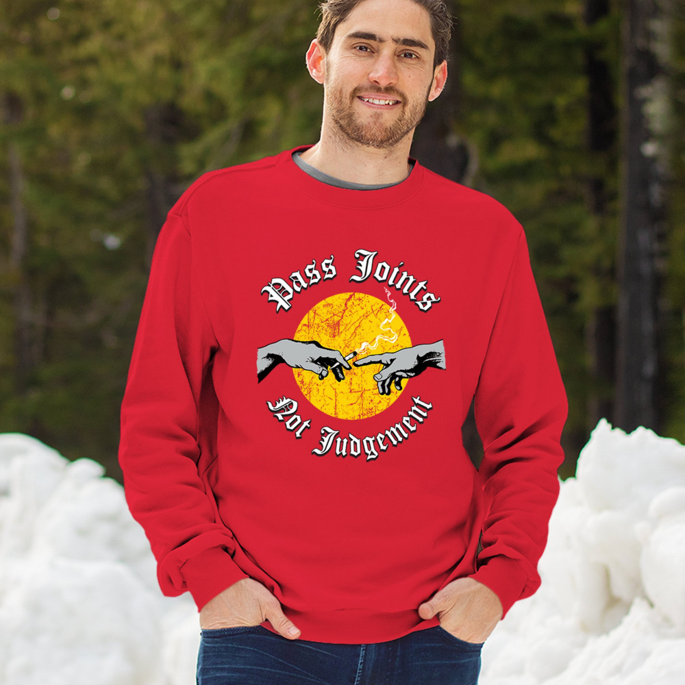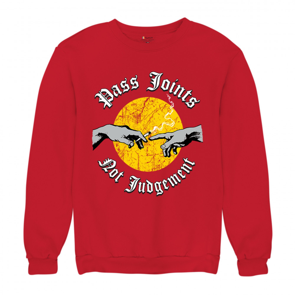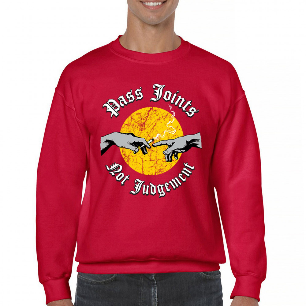 Cannabis culture twist on classic art. Hands passing a joint with “Pass Joints Not Judgement†message. Chill, bold, and unapologetically stoner.