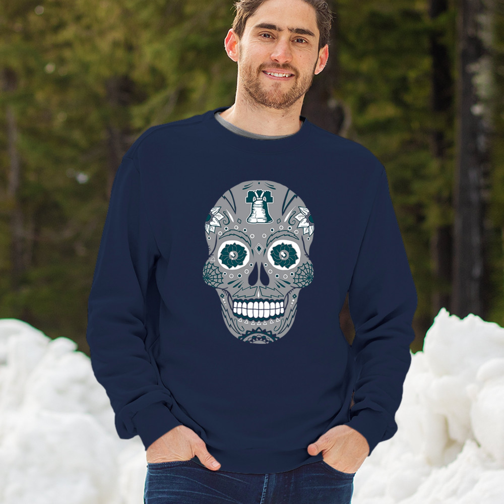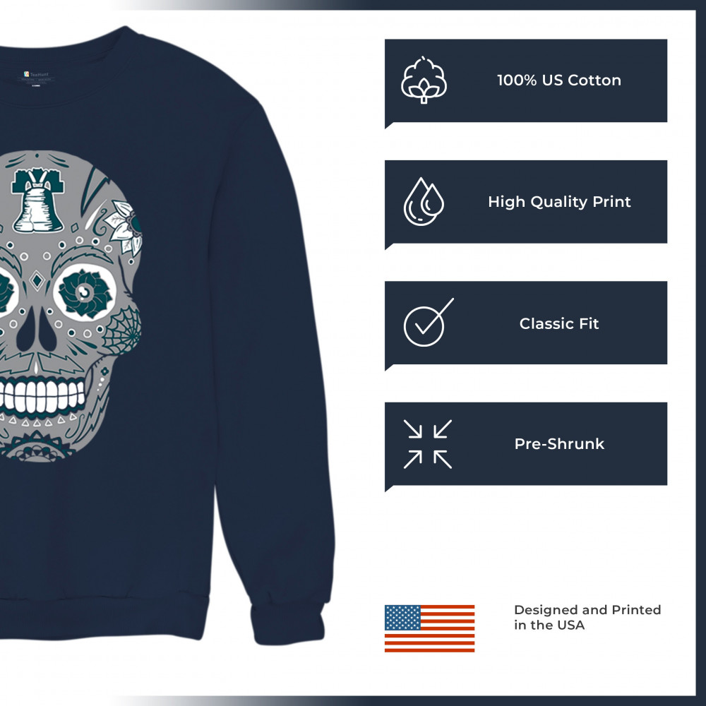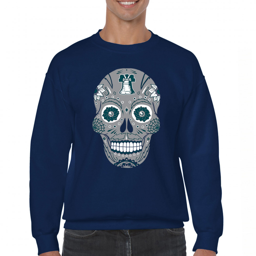 Philly meets tradition in this Sugar Skull design, mixing calavera art with the iconic liberty bell and marigold flowers. Perfect for Philly sports culture, fantasy league energy, or game day skull vibes, it captures Philly gothic art and fan zone spirit. A unique way to honor Dia de los Muertos while showing local Philadelphia pride and heritage in bold style.