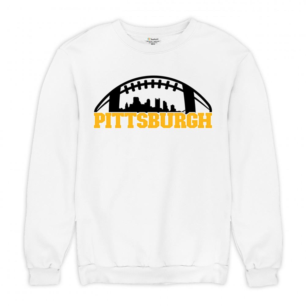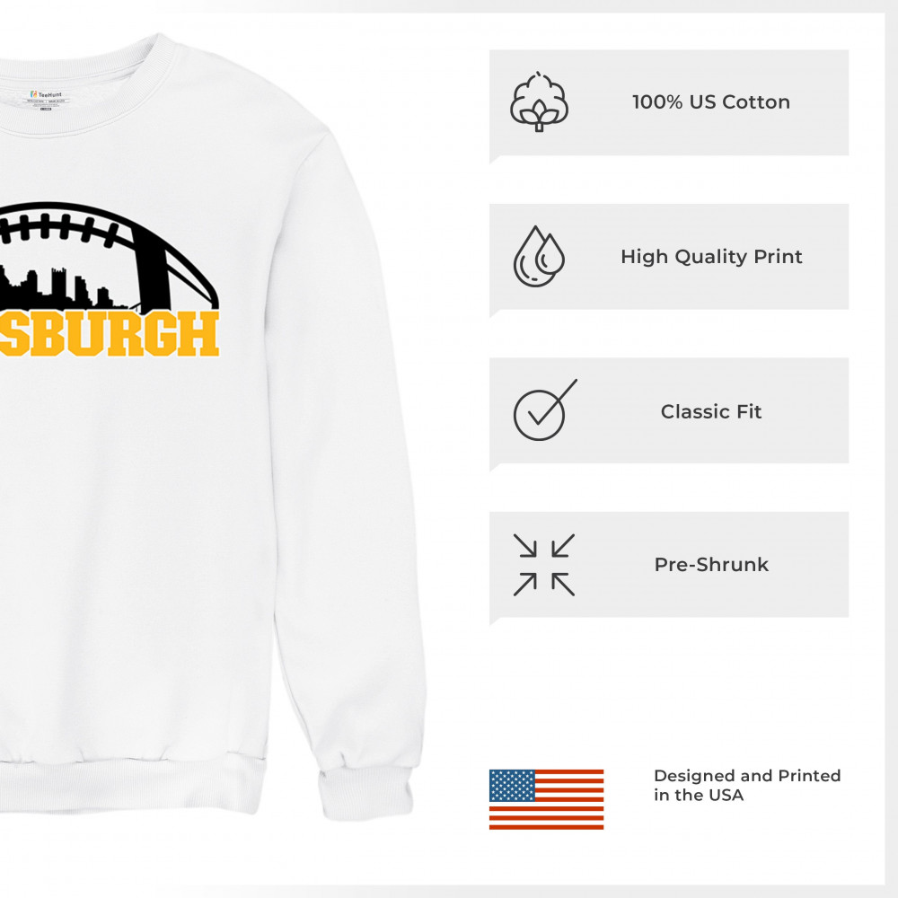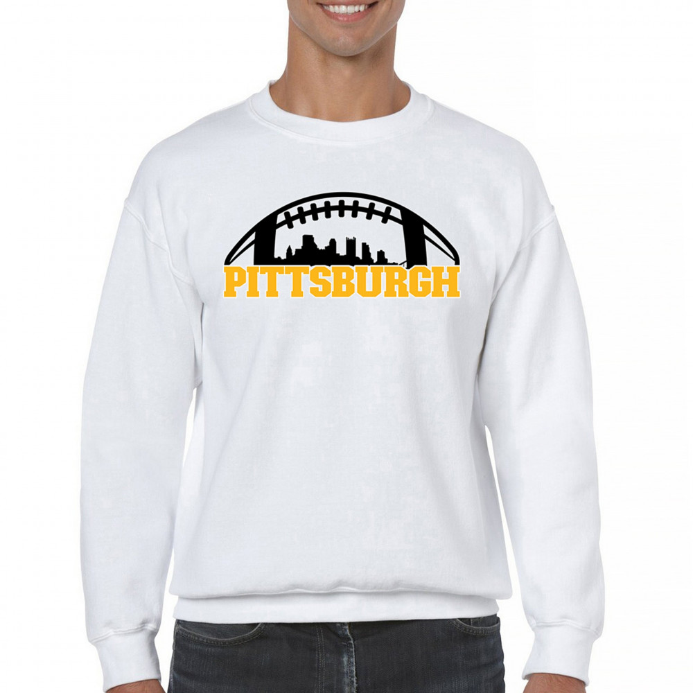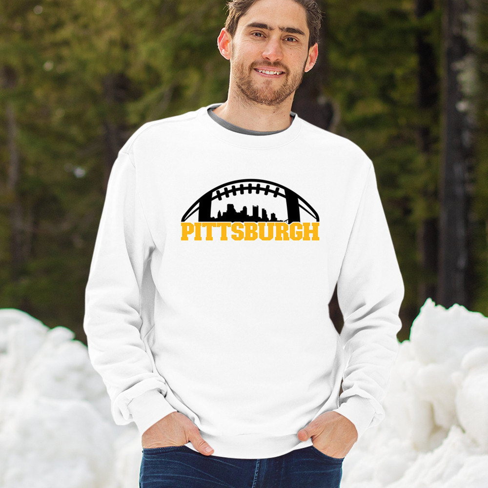 Embrace your Steel City pride with this bold Pittsburgh-themed design, showcasing the city skyline in a unique football graphic. Perfect for game day celebrations, tailgating parties, or everyday wear, this design captures the energy and passion of Pittsburgh's legendary sports culture. Whether you're cheering on your favorite team or representing your city, this design is a must-have for Pittsburgh fans.