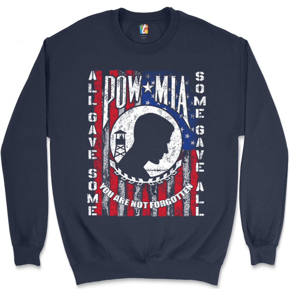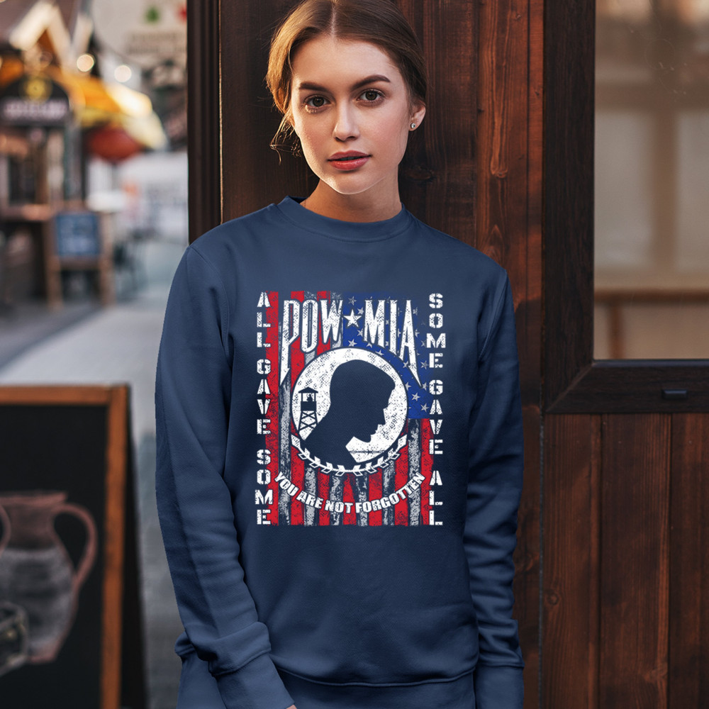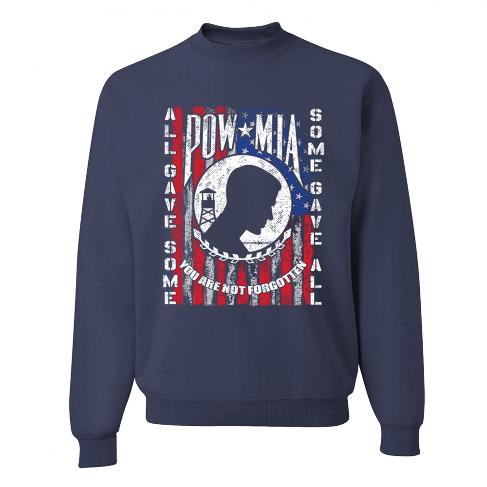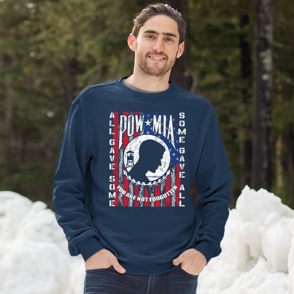 A patriotic print featuring the combination of the National League of Families' POW/MIA flag with a distressed American flag. On the sides of the flag it features the phrase: "All Gave Some, Some Gave All". Great choice to wear on Patriot's Day, Memorial