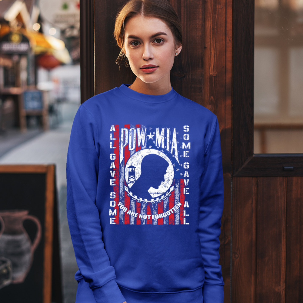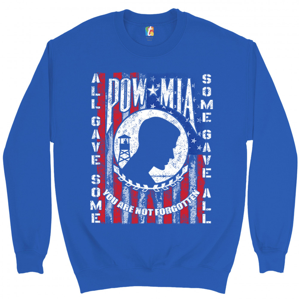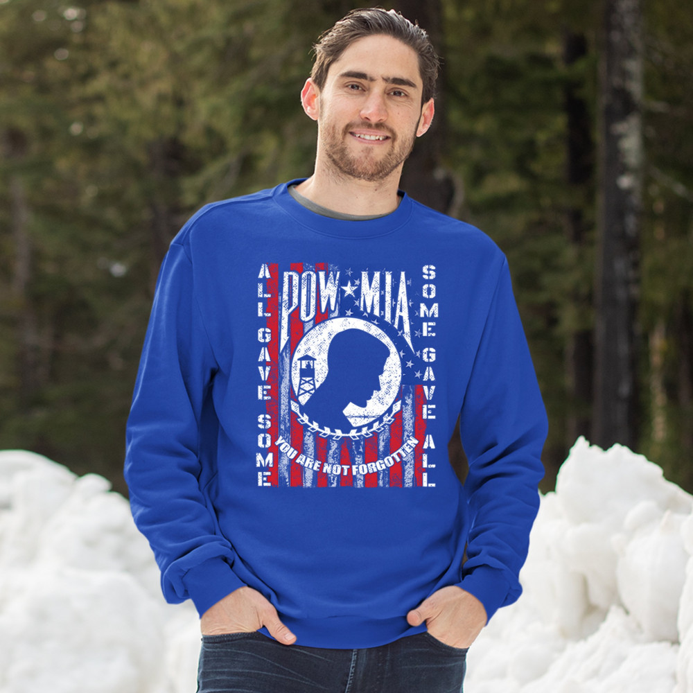 A patriotic print featuring the combination of the National League of Families' POW/MIA flag with a distressed American flag. On the sides of the flag it features the phrase: "All Gave Some, Some Gave All". Great choice to wear on Patriot's Day, Memorial