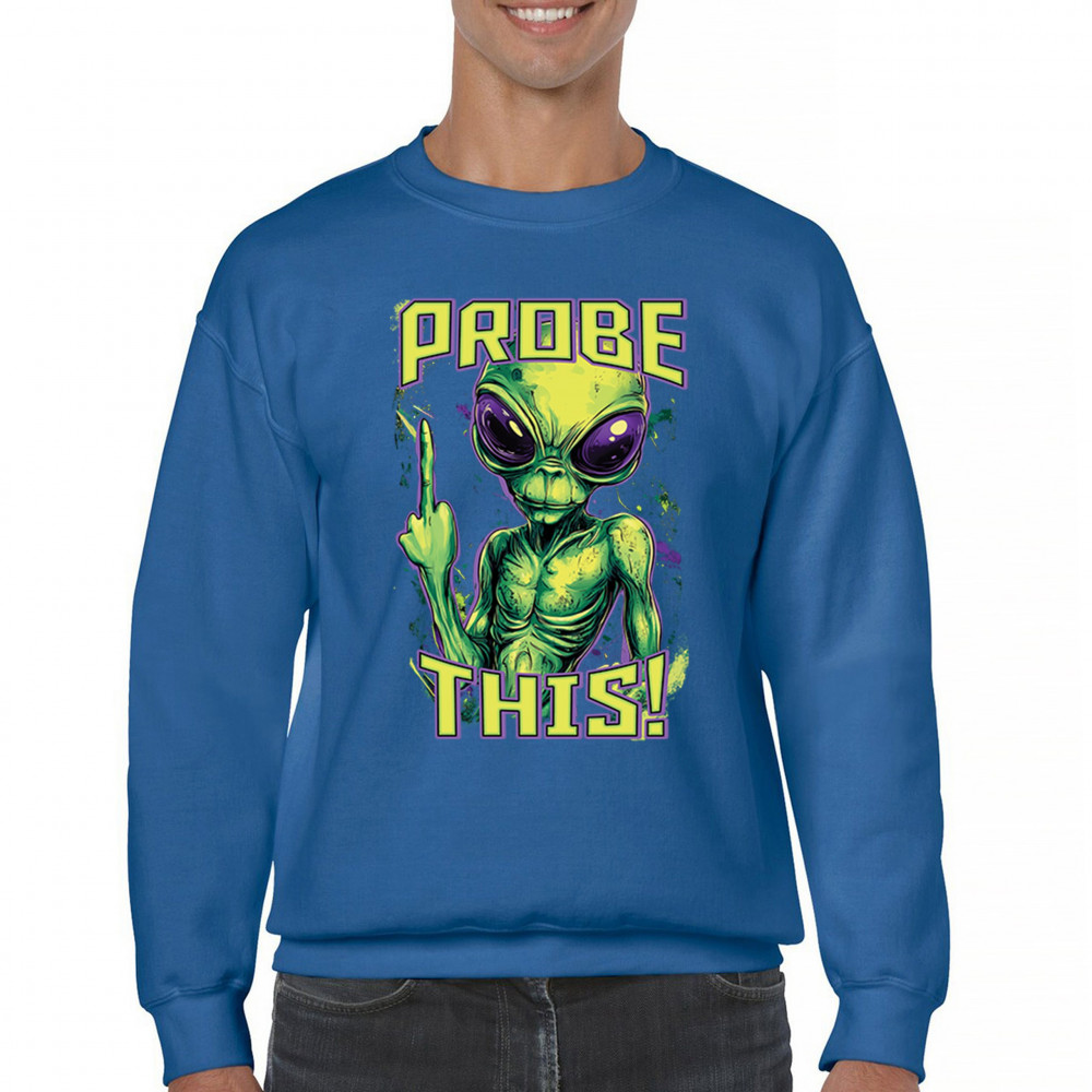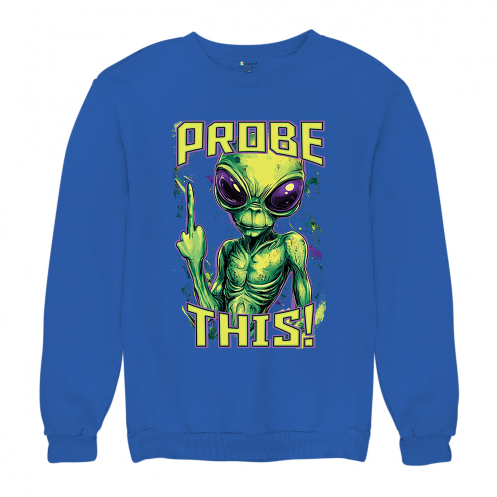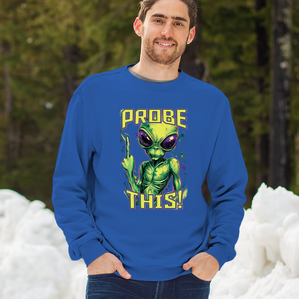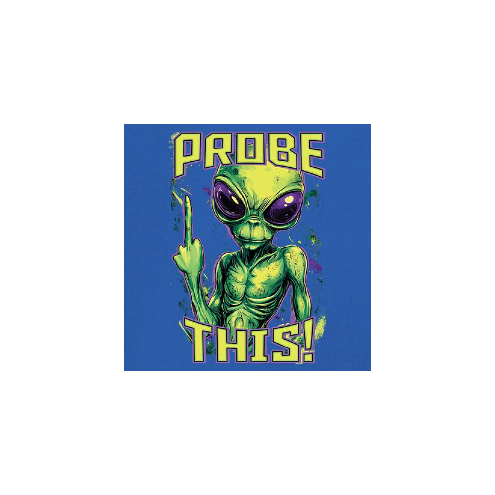 Alien attitude goes full throttle in this rebellious design featuring a defiant extraterrestrial flipping the bird. Bold green and purple tones amplify the sarcasm, making it perfect for UFO fans, protest vibes, and anyone with a dark sense of humor. Wear it loud to alien fests, parties, or anytime you want to stir the stars.