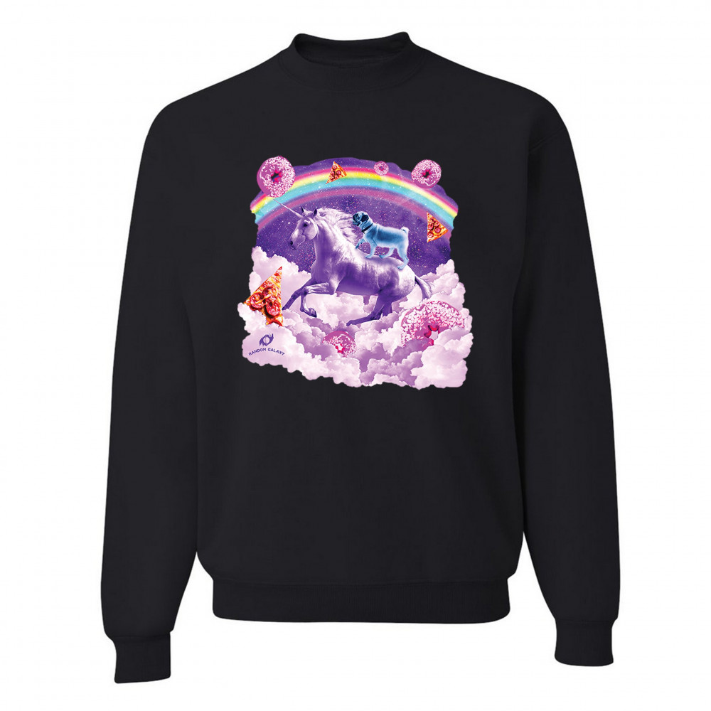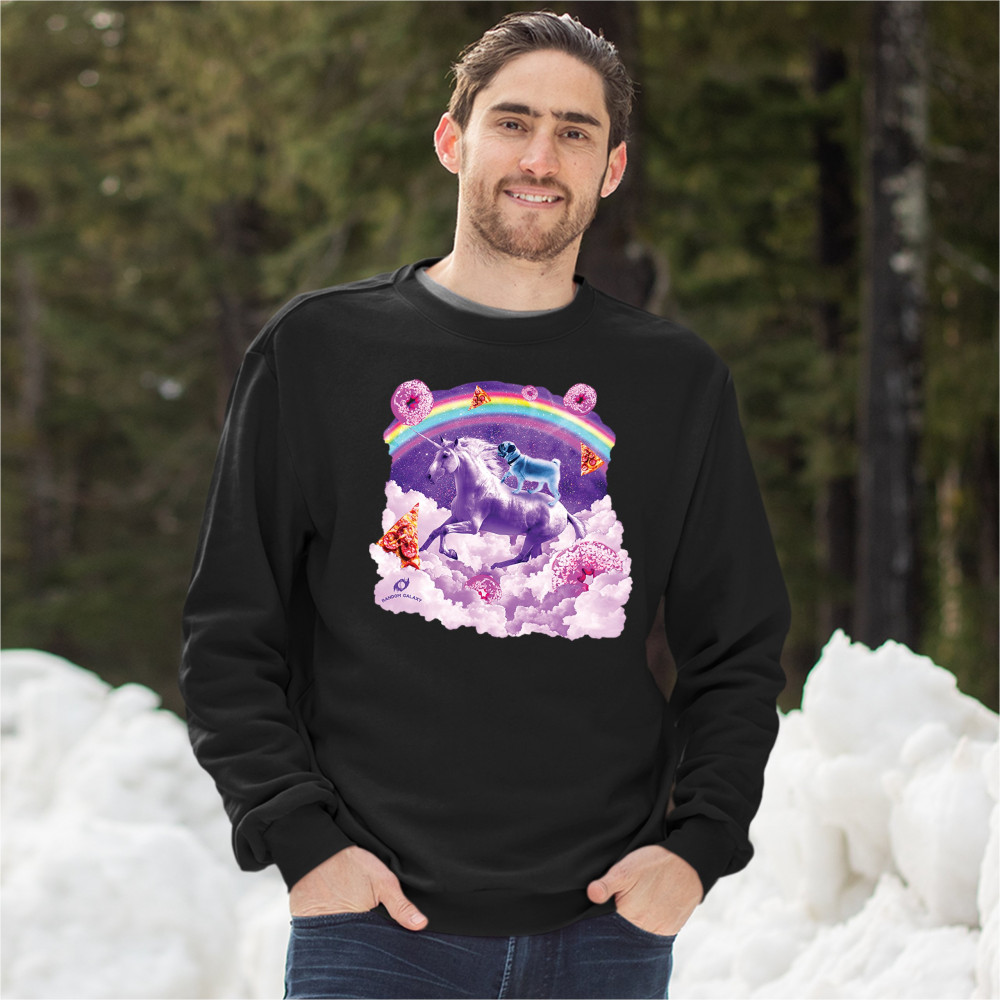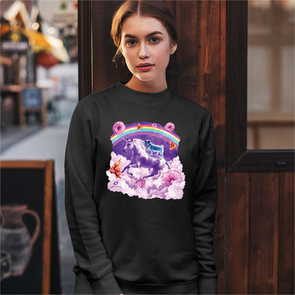 A beautiful print featuring a pug standing on a back of a unicorn galloping through clouds. In the background a rainbow crossing the space is seen. Across the clouds numerous pizza slices and donuts are scattered. A great choice for a person who loves pug