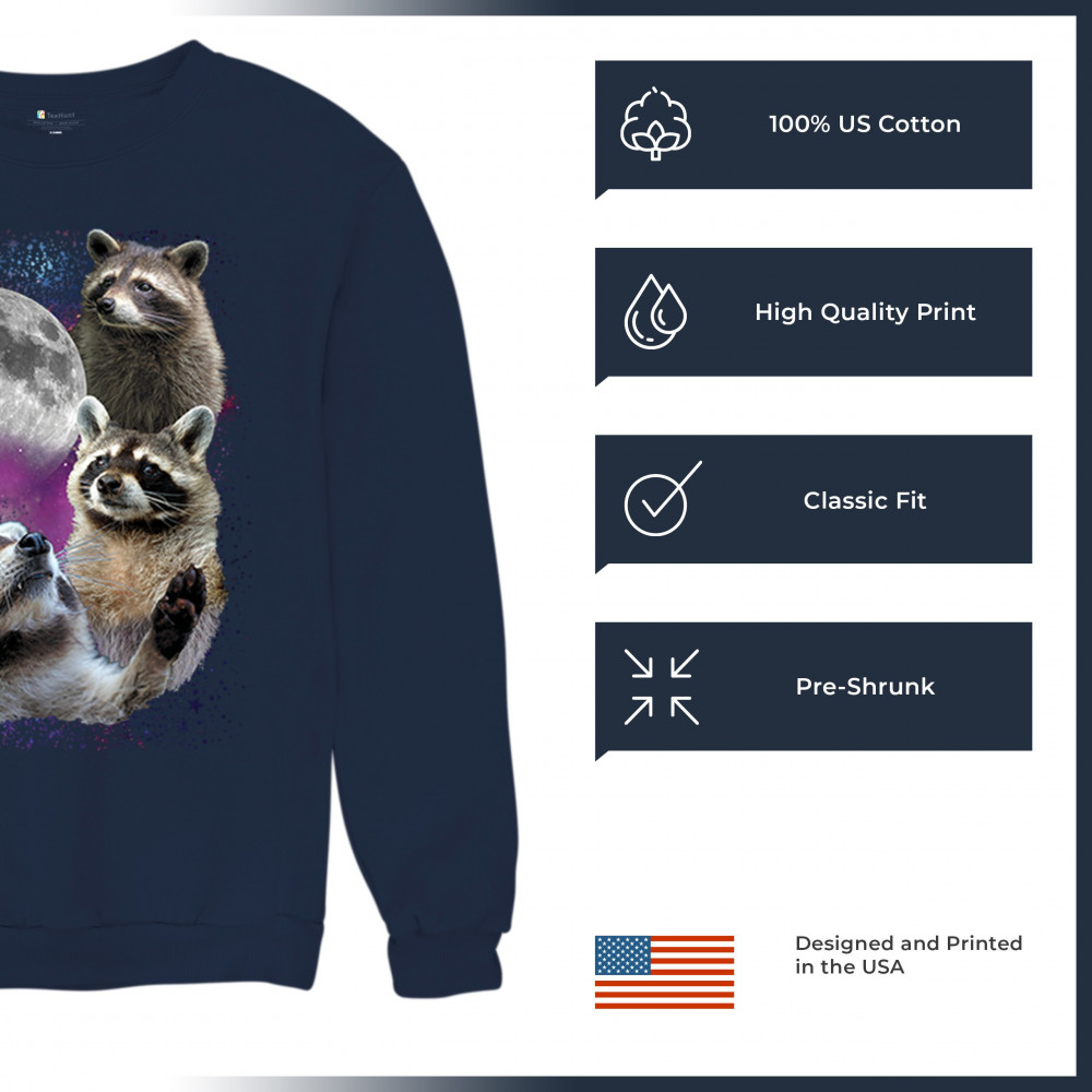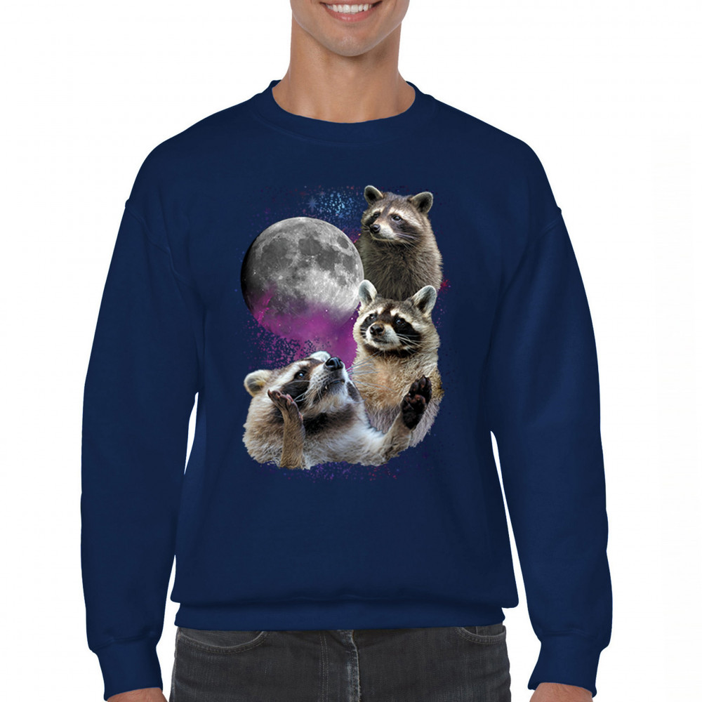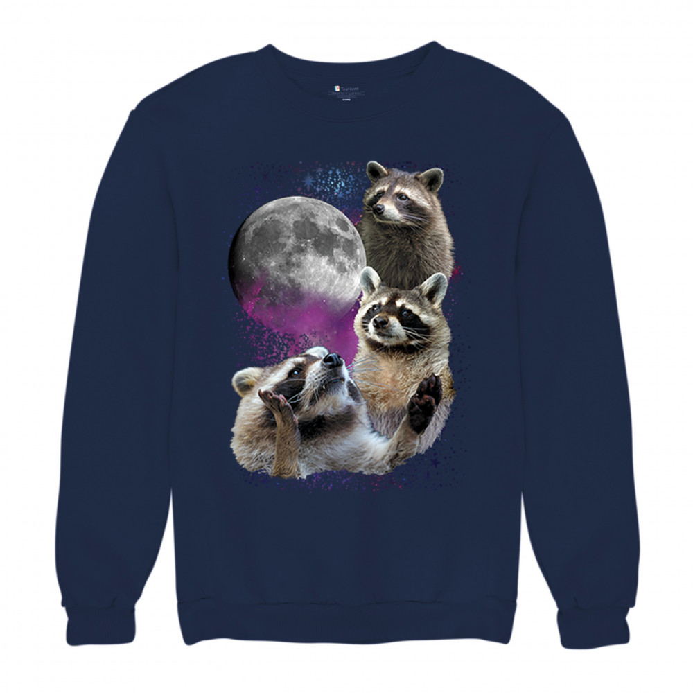 Embrace nature with this quirky raccoon and moon design, perfect for space and animal lovers. Ideal for casual wear or gifts.