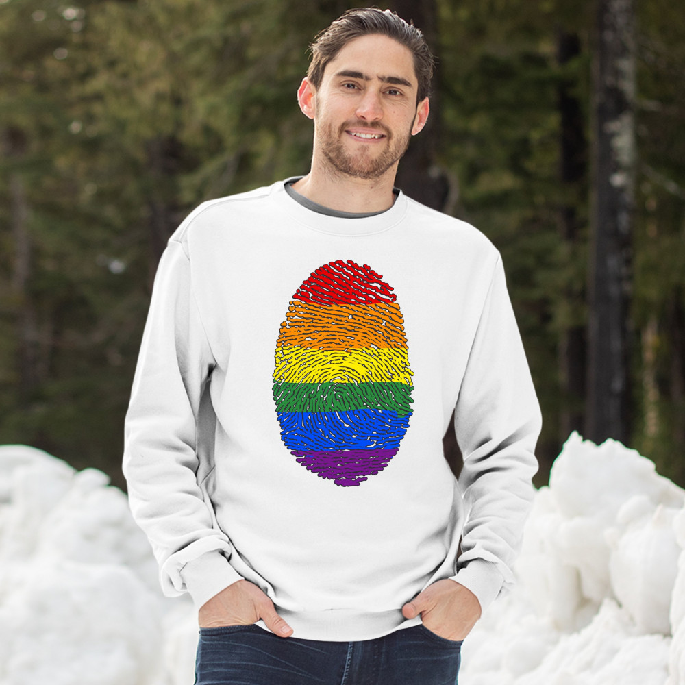 A print featuring a fingerprint painted in rainbow colors. Great choice to wear as a proud queer person.