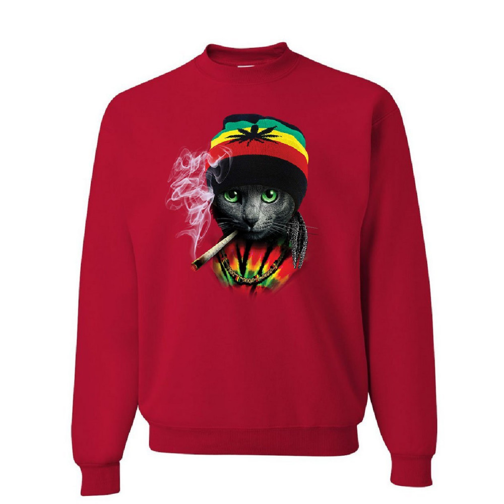 RASTA CAT sweatshirt smoking joint 420 jamaica marijuana pot weed sweater red