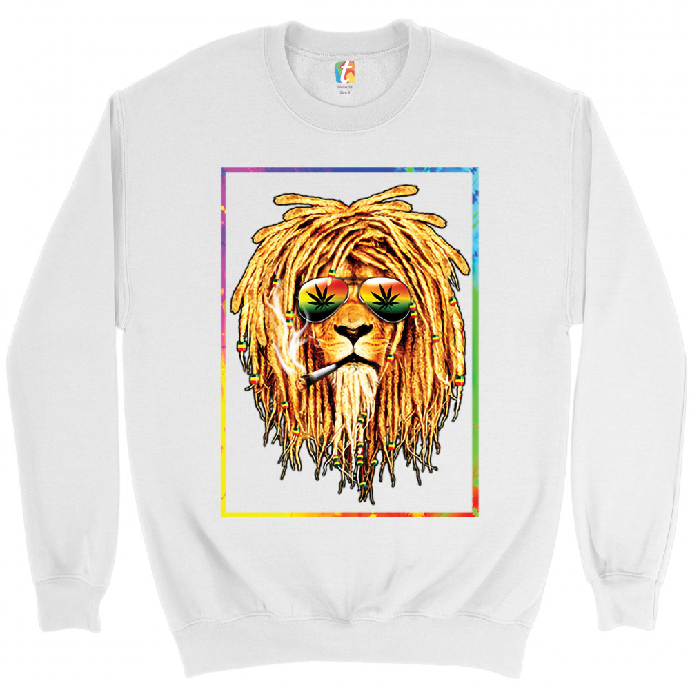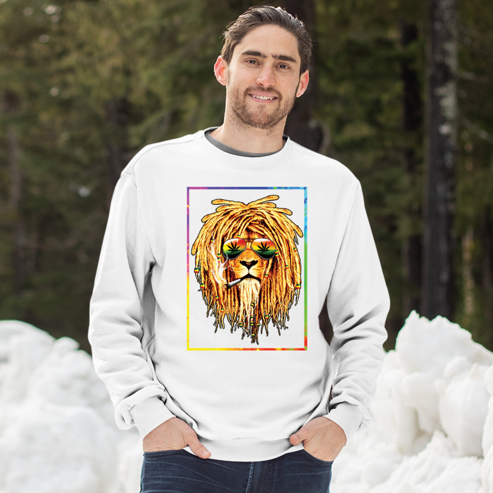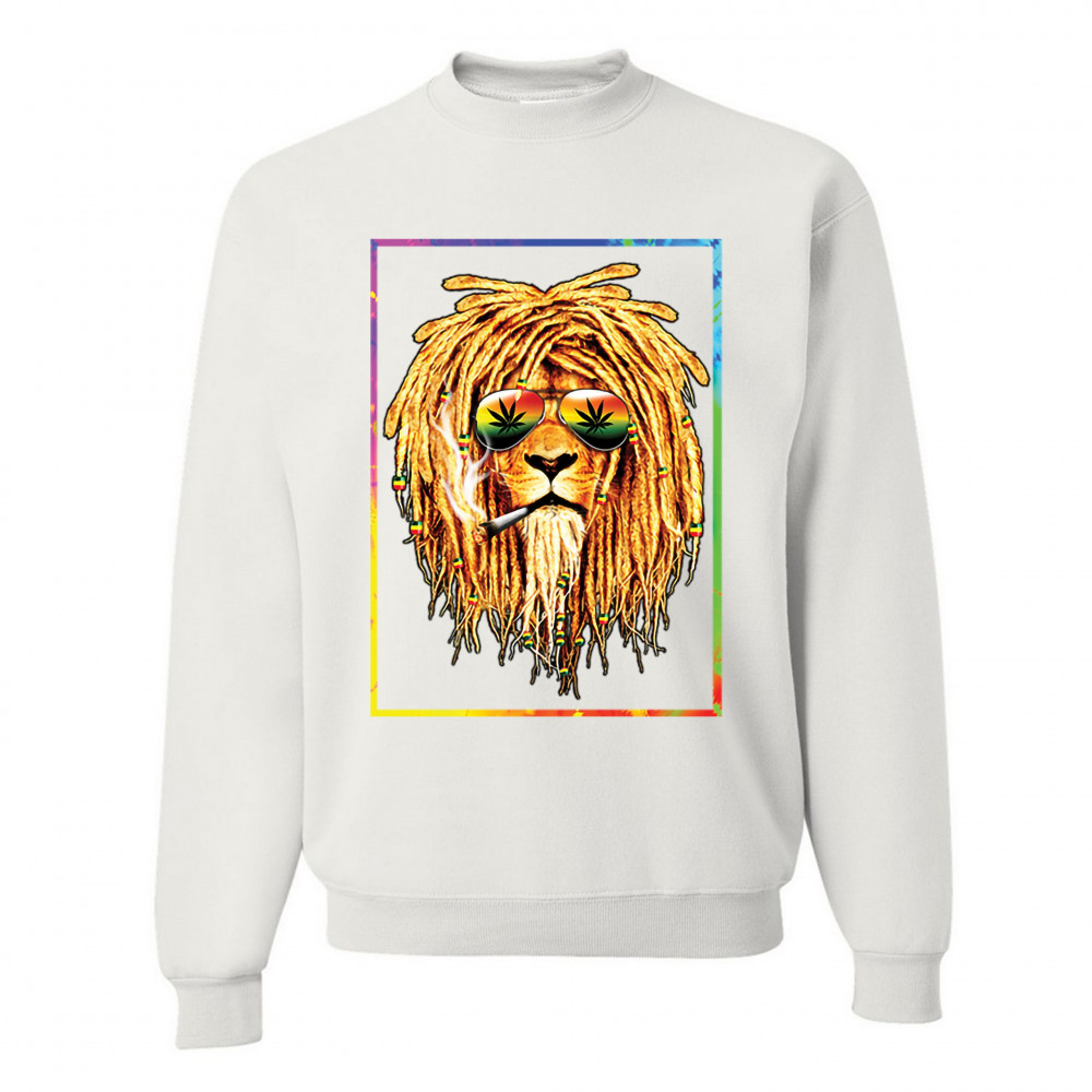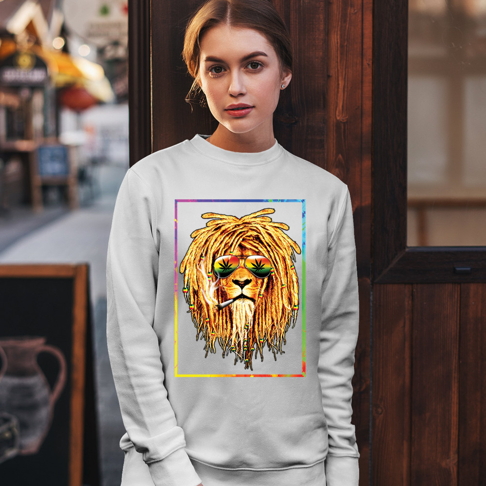 A print featuring a lion with dreadlocks smoking a joint and wearing sunglasses with marijuana leaves reflected in the them. The beads on the lion's dreadlocks and the glasses are painted with traditional Jamaican colors. Great choice for a pot aficionado