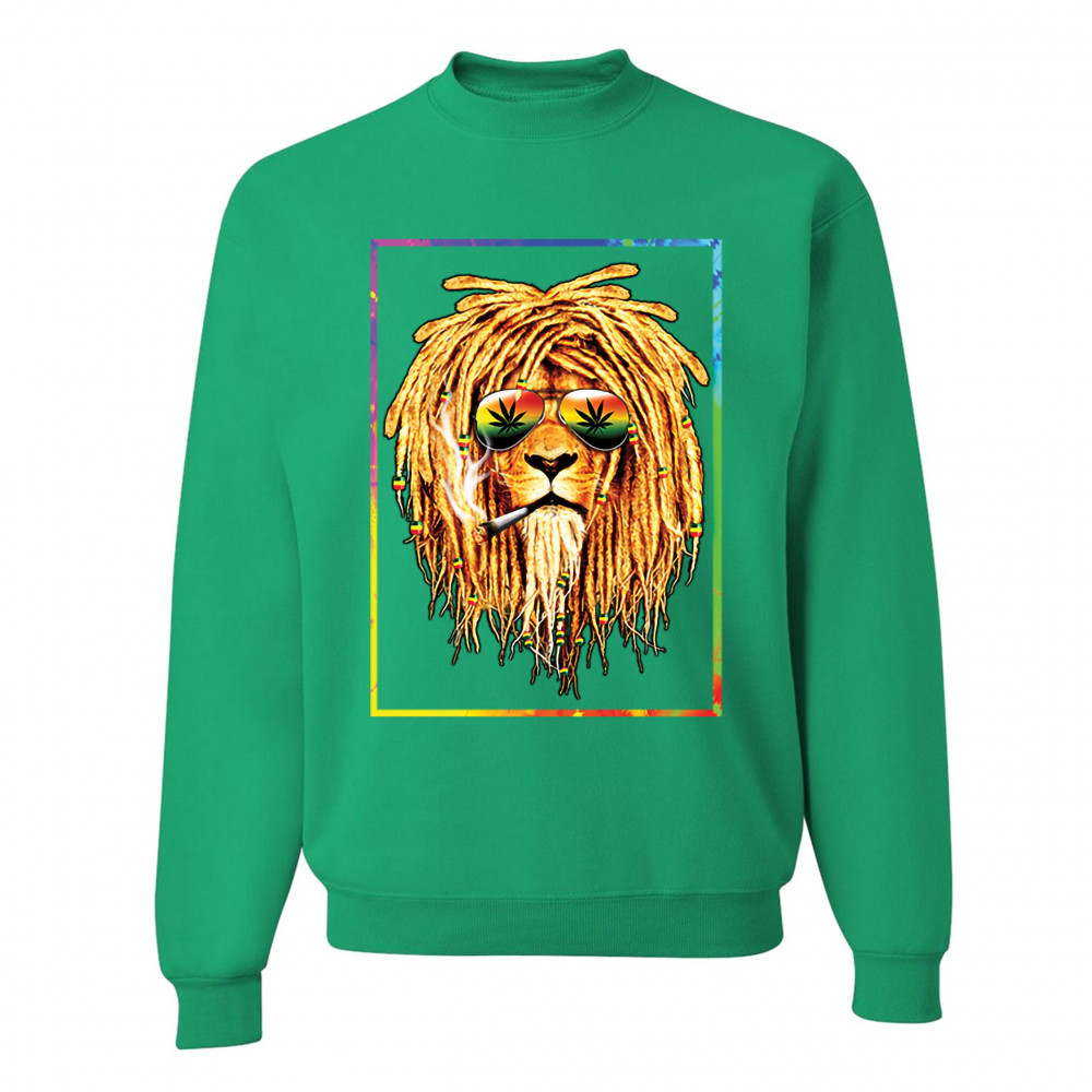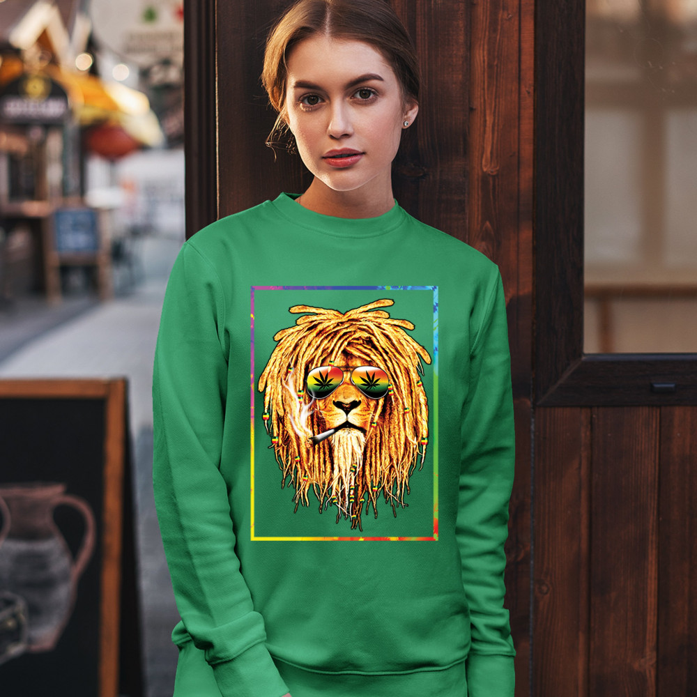 A print featuring a lion with dreadlocks smoking a joint and wearing sunglasses with marijuana leaves reflected in the them. The beads on the lion's dreadlocks and the glasses are painted with traditional Jamaican colors. Great choice for a pot aficionado