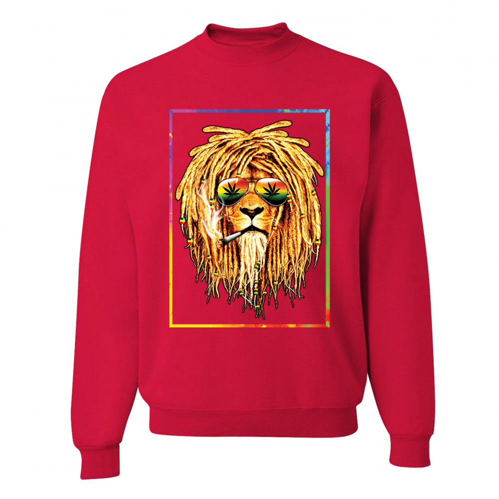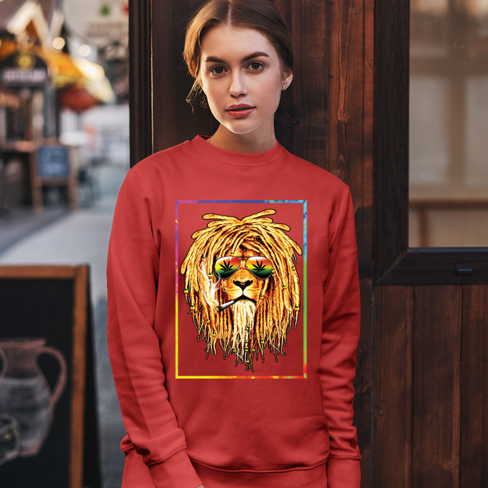A print featuring a lion with dreadlocks smoking a joint and wearing sunglasses with marijuana leaves reflected in the them. The beads on the lion's dreadlocks and the glasses are painted with traditional Jamaican colors. Great choice for a pot aficionado