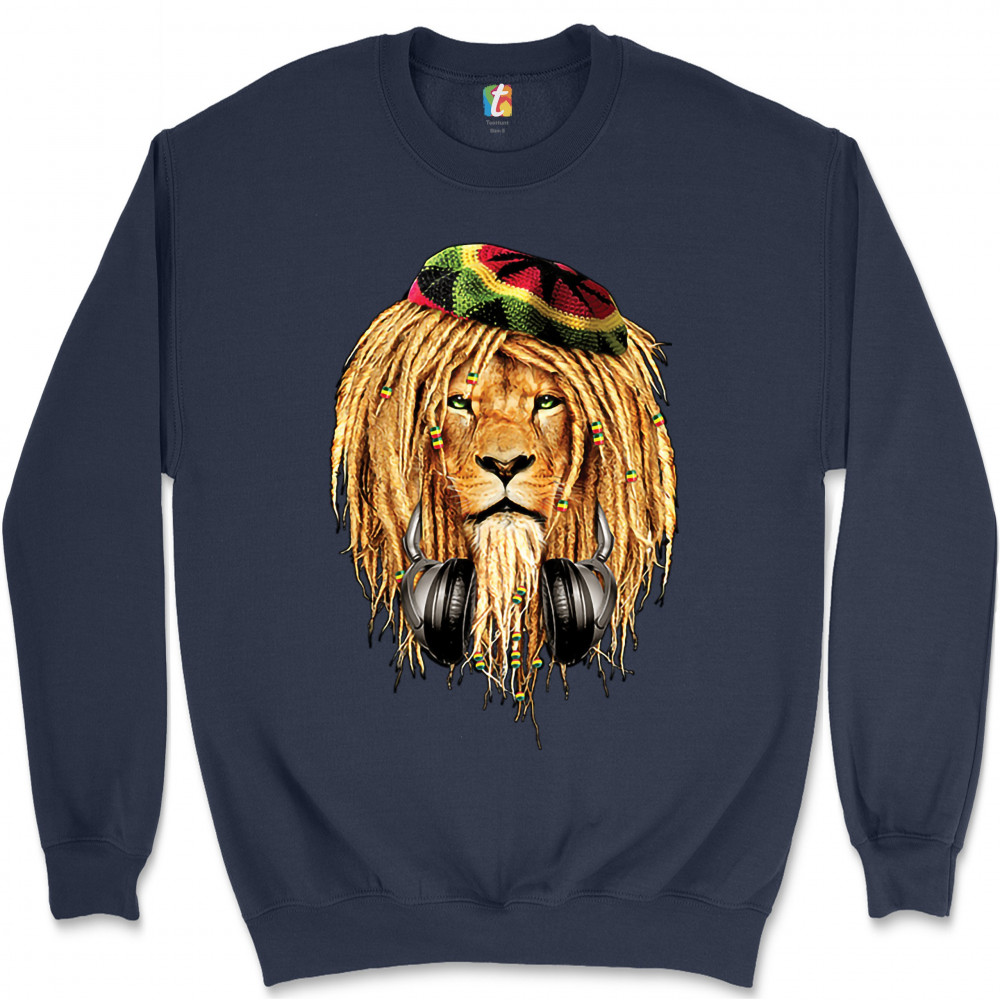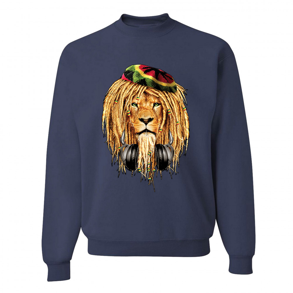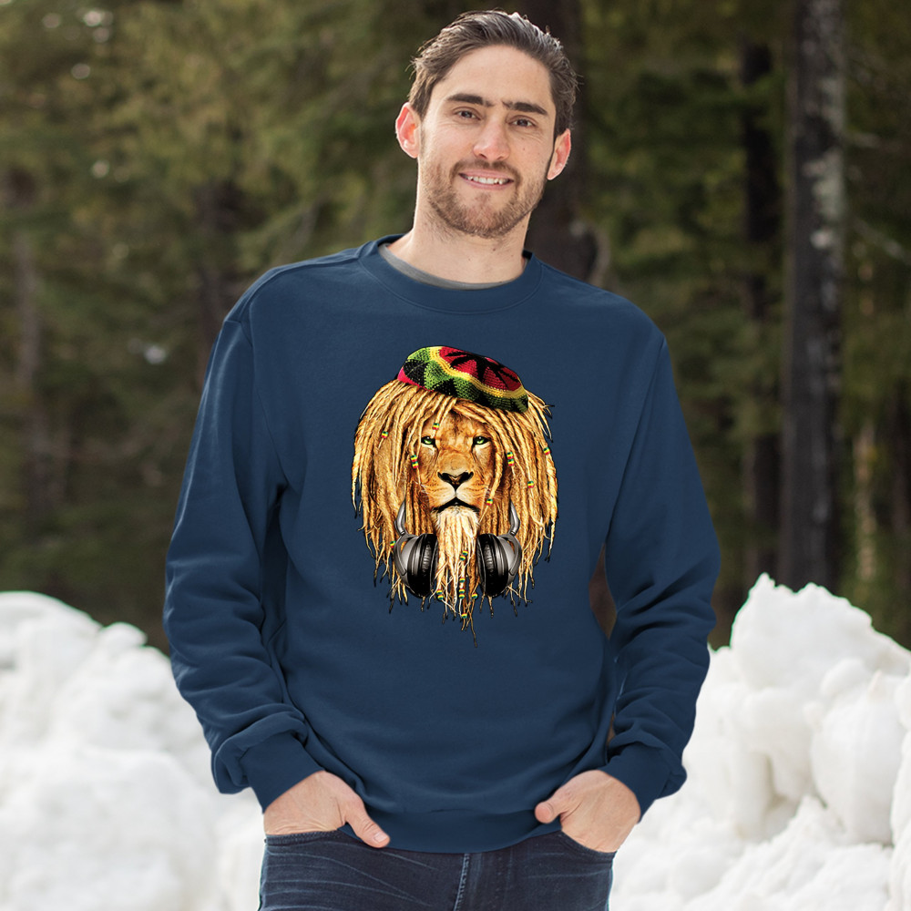 RASTA LION WITH HEADPHONES sweatshirt jah jamaica reggae 420 culture crewneck navy blue