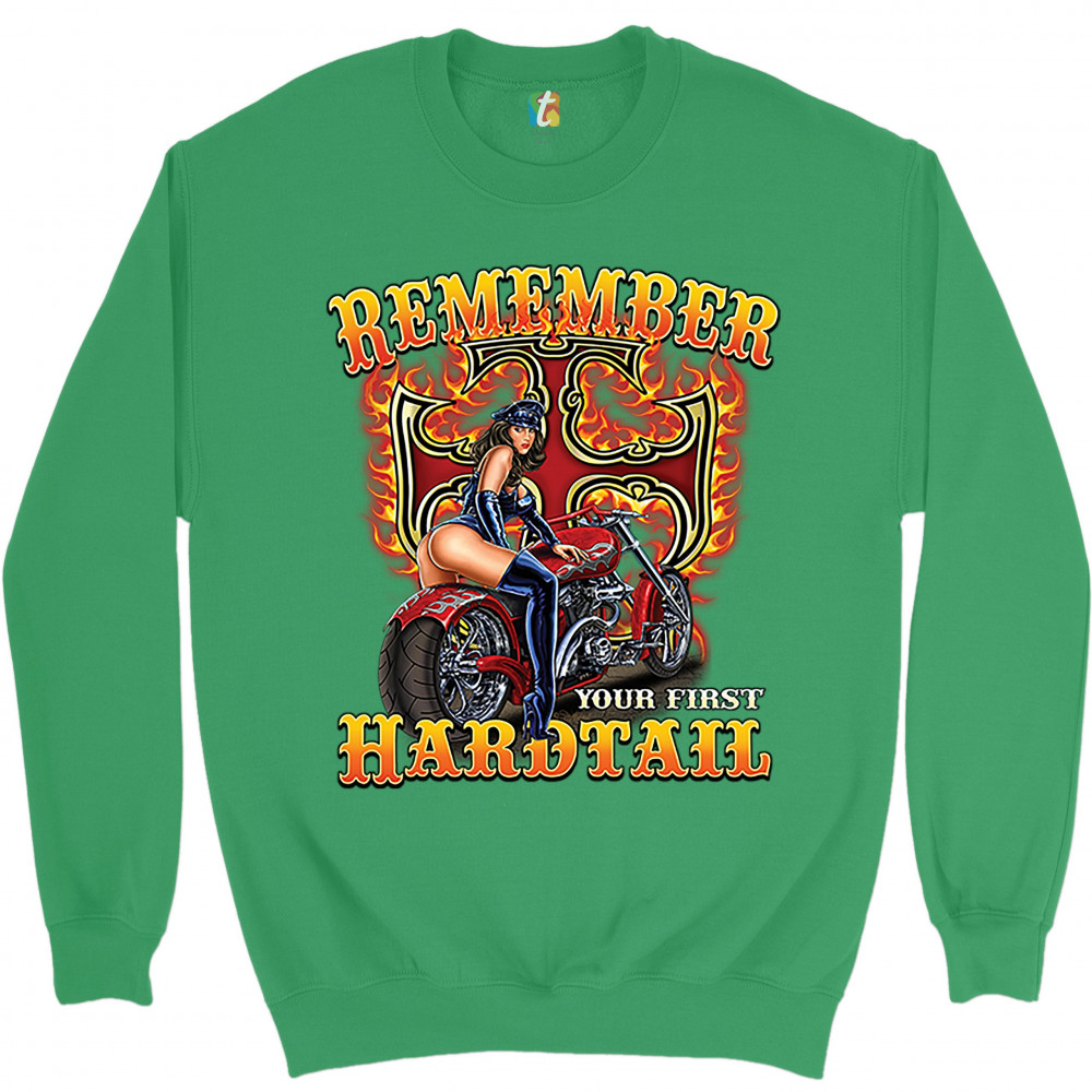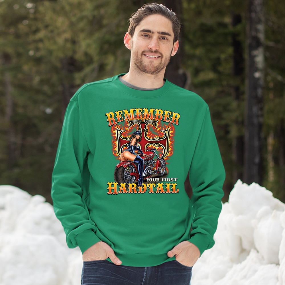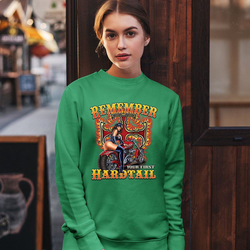 REMEMBER YOUR FIRST HARDTAIL sweatshirt biker babe motorcycle chopper crewneck green