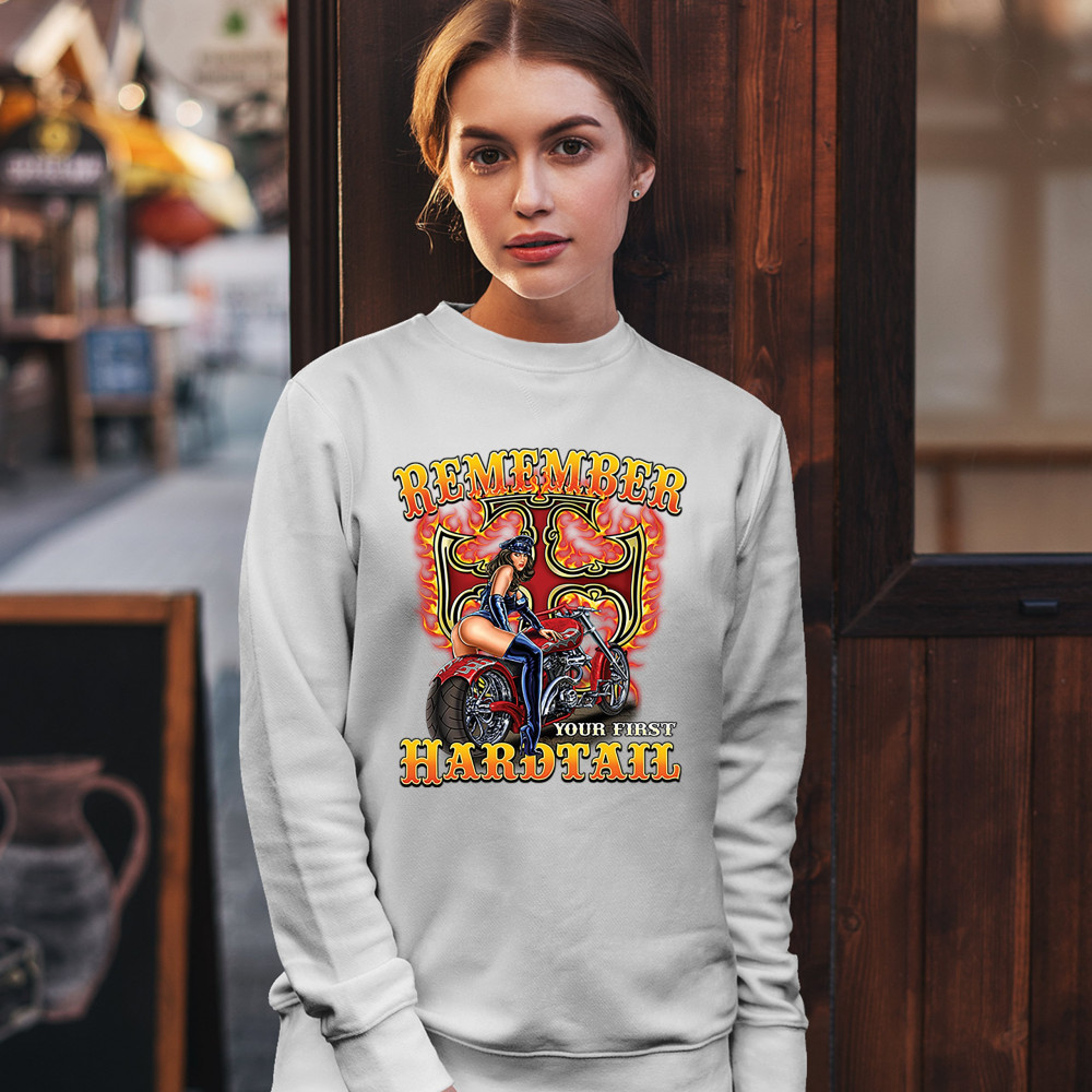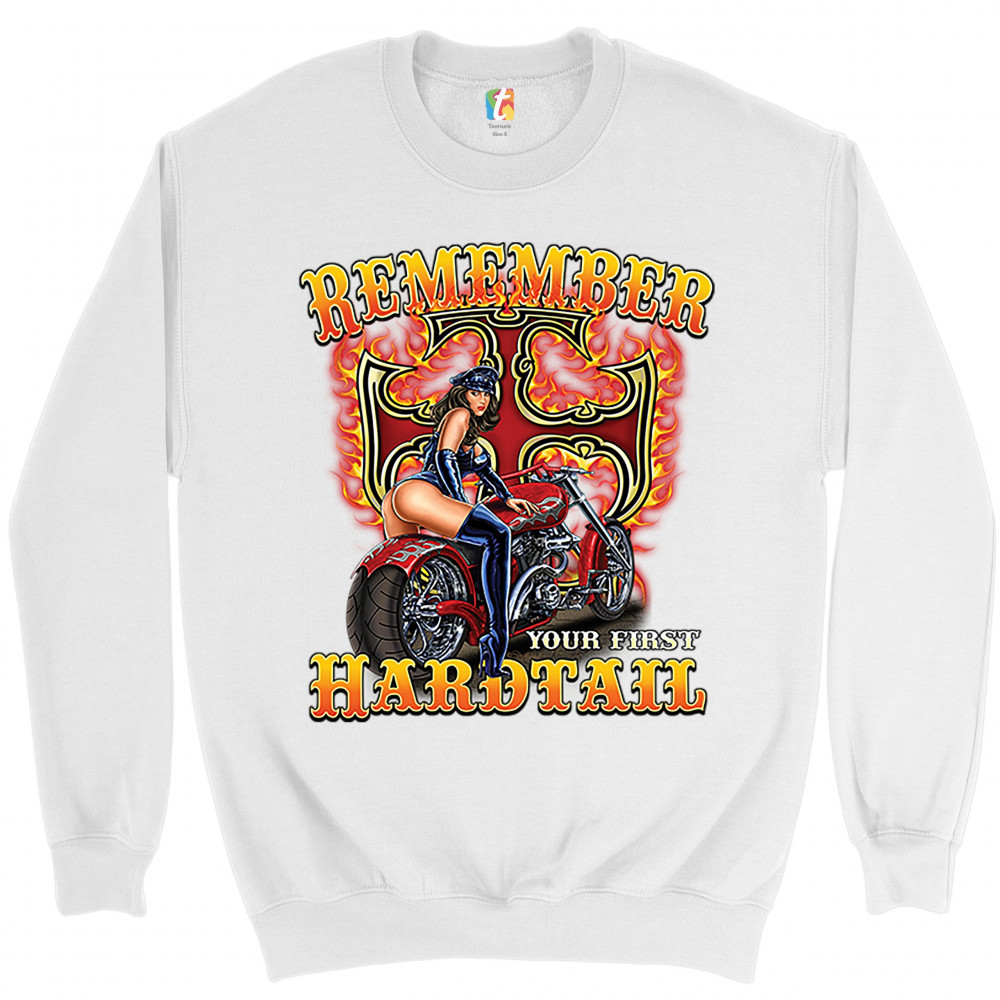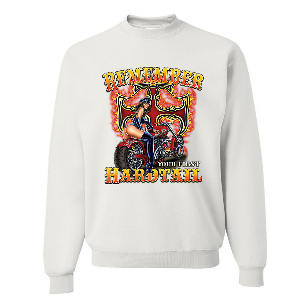 REMEMBER YOUR FIRST HARDTAIL sweatshirt biker babe motorcycle chopper crewneck white