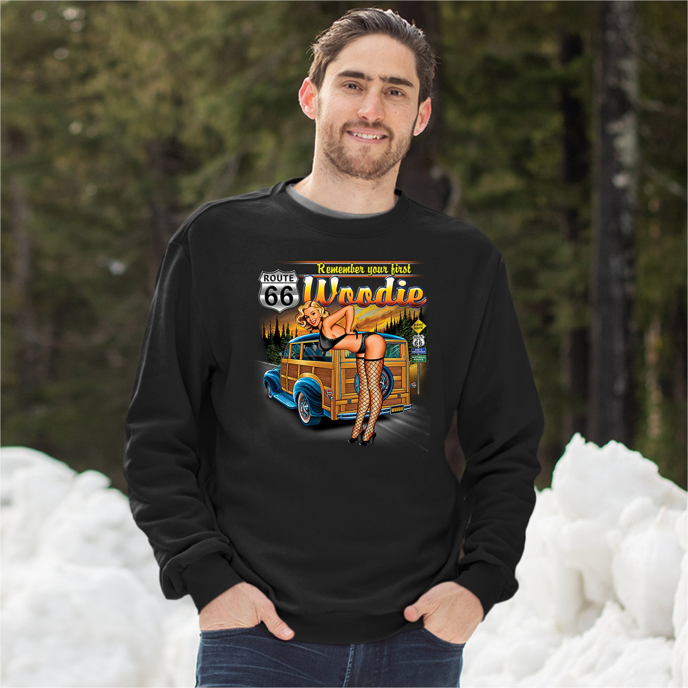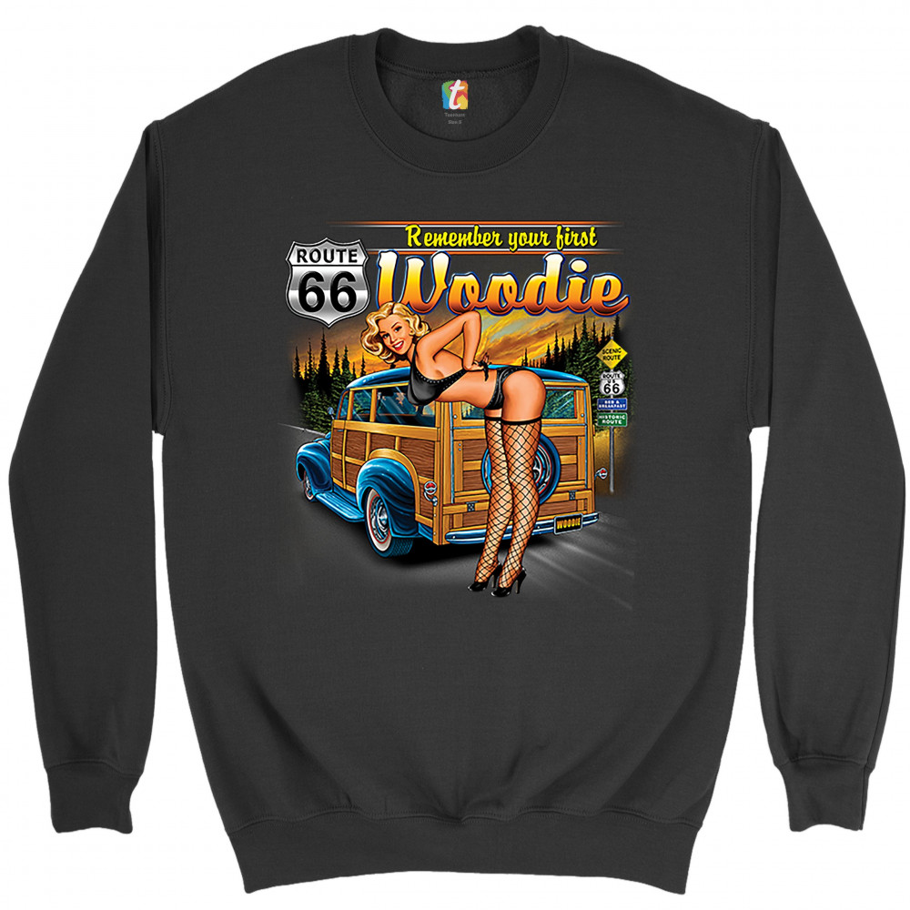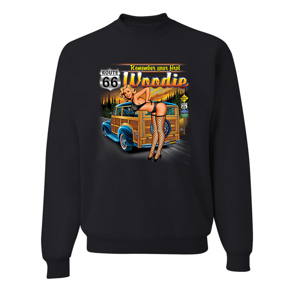A print featuring a sexy blonde pin-up girl bending over and taking off her bra. Behind her there is a woodie wagon driving on a road. The print says: "Remeber your first woodie" and features a Route 66. A great choice for a fan of the legendary Mother Ro