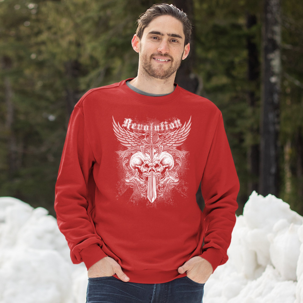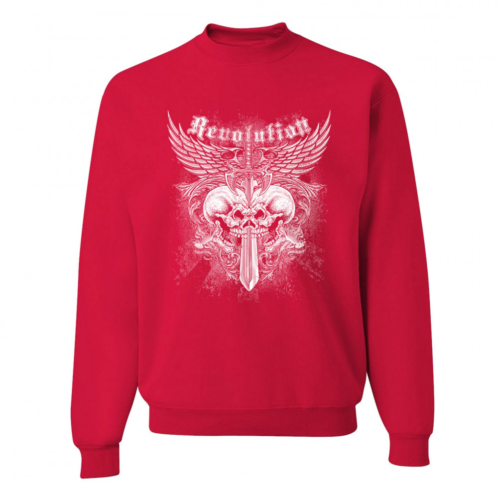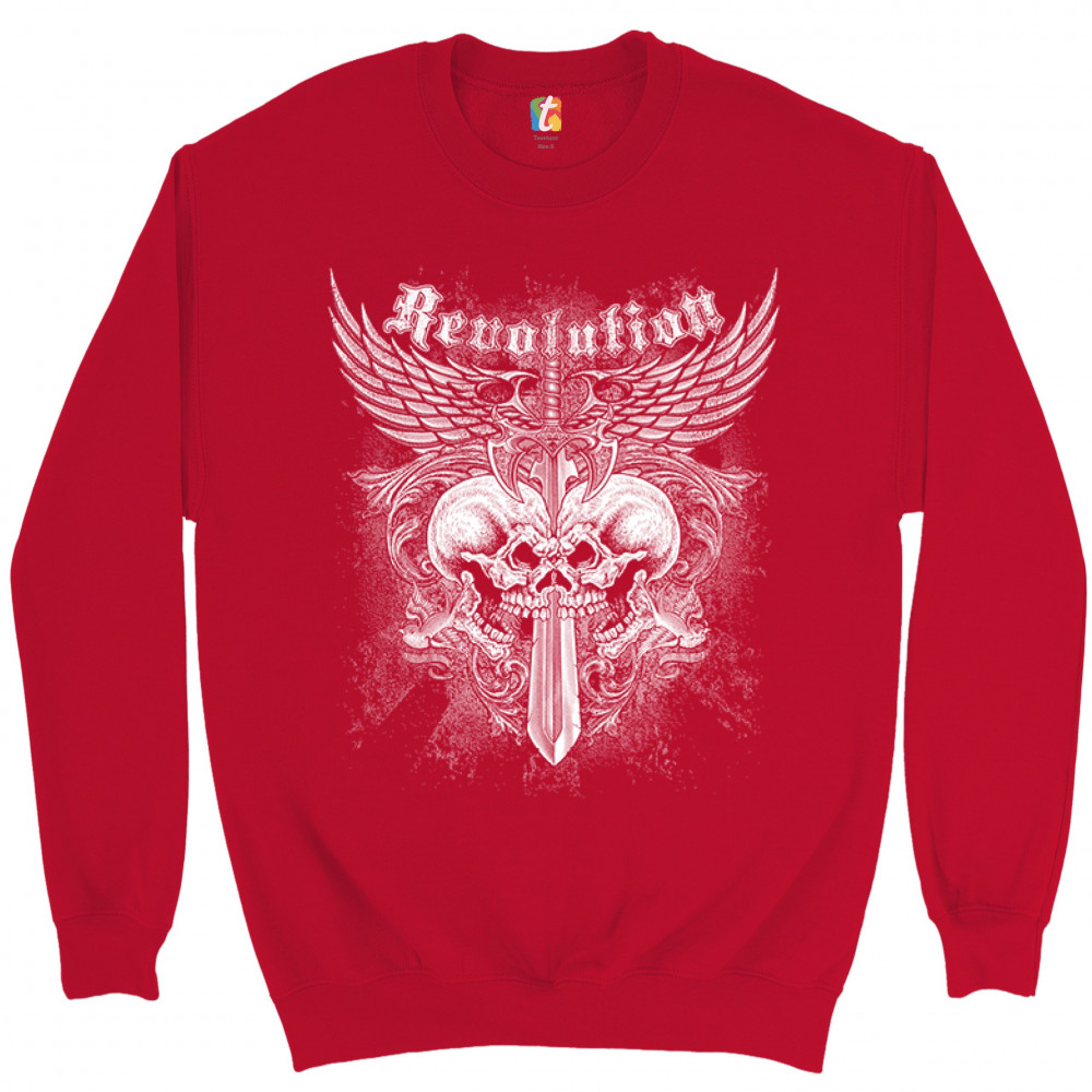 A print featuring a pair of skulls roaring at each other and butting heads. Between them there is a huge sword. In the background there is a pair of wings. The print says "Revolution". A great choice for a person who is into horror movies, sci-fi comic bo
