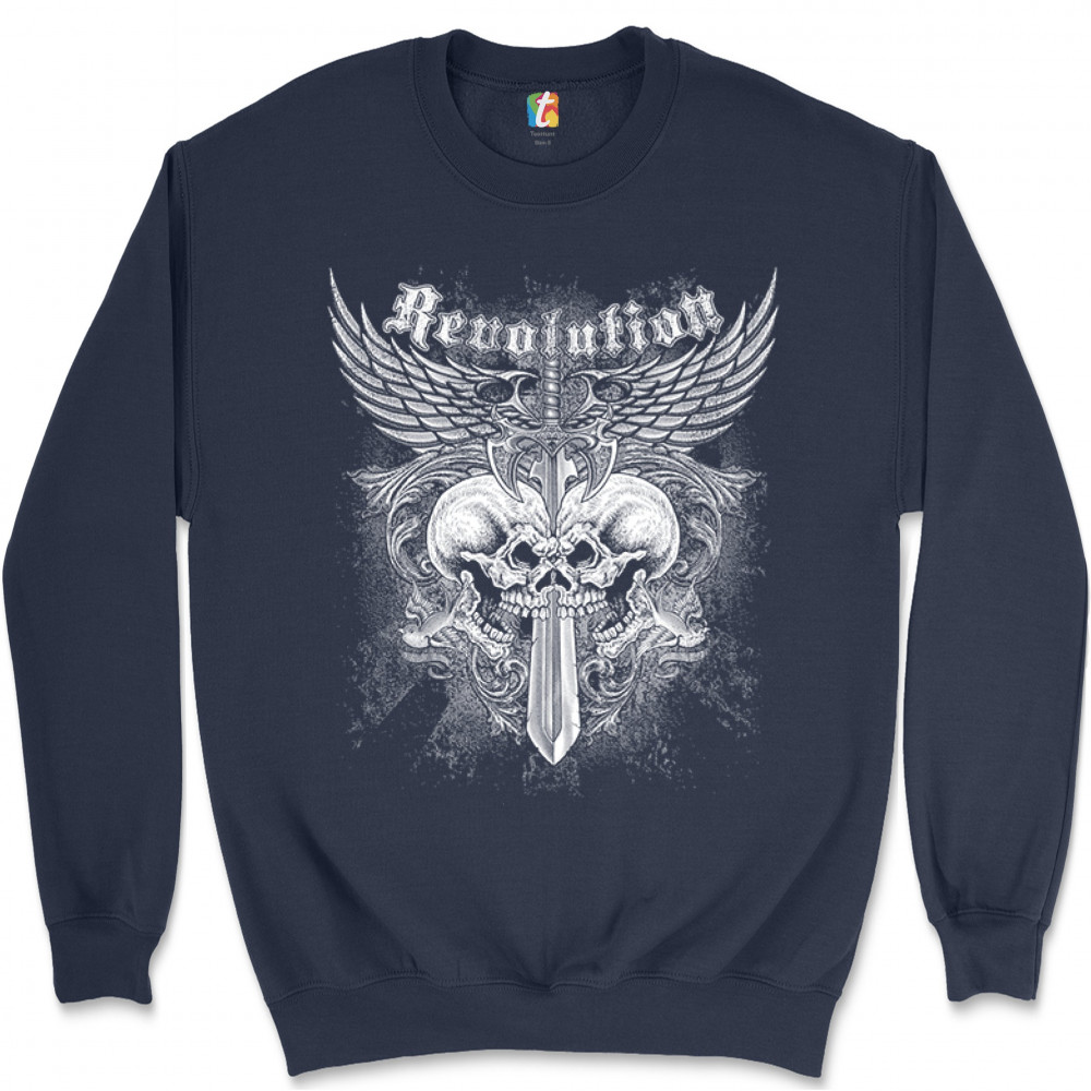 A print featuring a pair of skulls roaring at each other and butting heads. Between them there is a huge sword. In the background there is a pair of wings. The print says "Revolution". A great choice for a person who is into horror movies, sci-fi comic bo