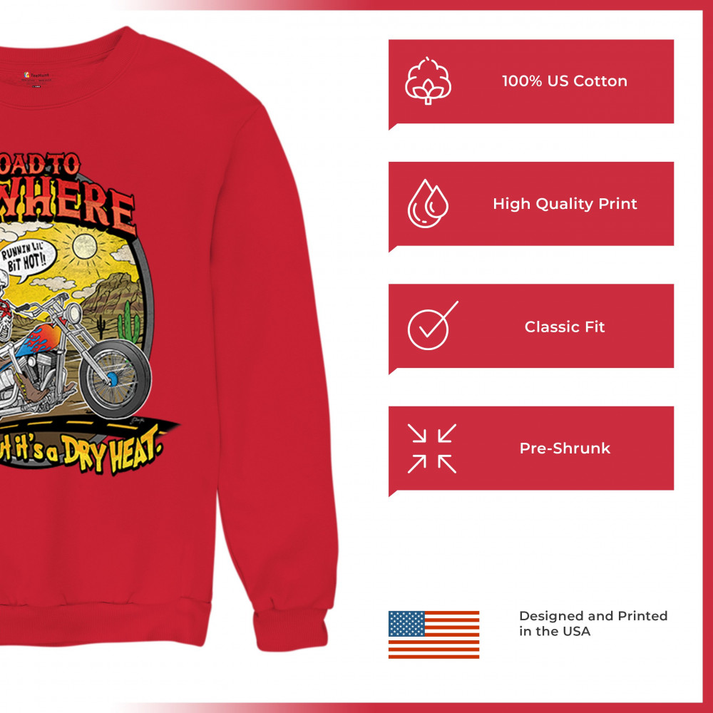 Our 'Road to Nowhere' tee is a salute to the thrill-seekers and the heat-bravers. Adorned with a bold skeleton cruising down Route 66, it embodies the spirit of adventure with a touch of playful defiance. A statement piece for anyone who lives for the ride and laughs in the face of danger. Join the ride into the sunset with this daring design.
