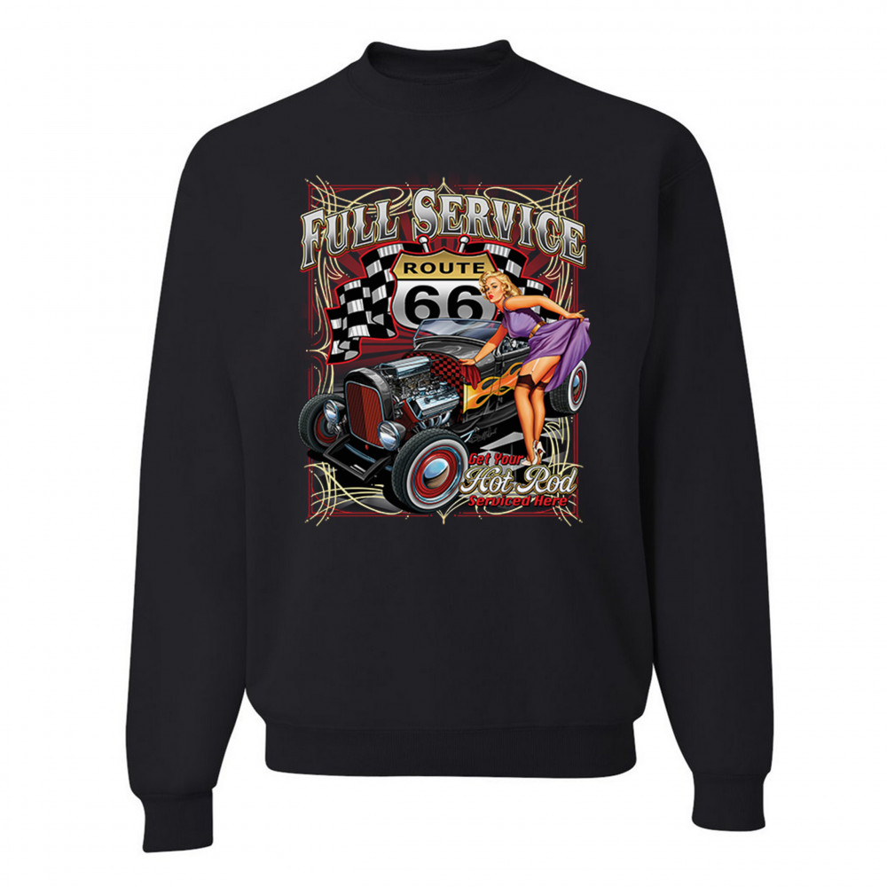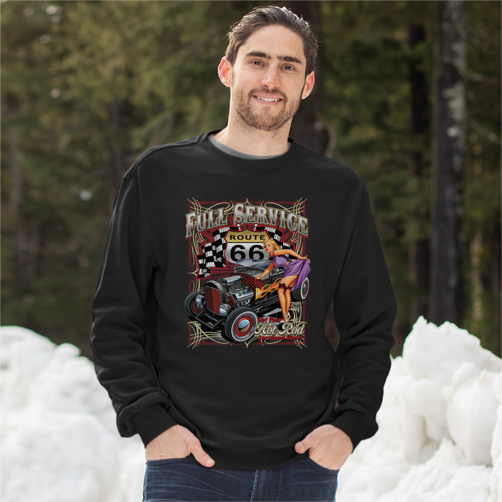 A print featuring a hot rod muscle car with flames painted on it's sides. There is a beautiful pin-up girl in stockings standing near it lifting her dress with one hand. The prints says: "full service" and "get your hot rod serviced here". In the background there is a Route 66 sign with racing flags to it's sides. Great for Route 66 and hot rod fans.