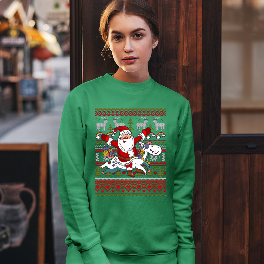 SANTA CLAUS RIDING A UNICORN sweatshirt merry christmas ugly sweater crewneck green