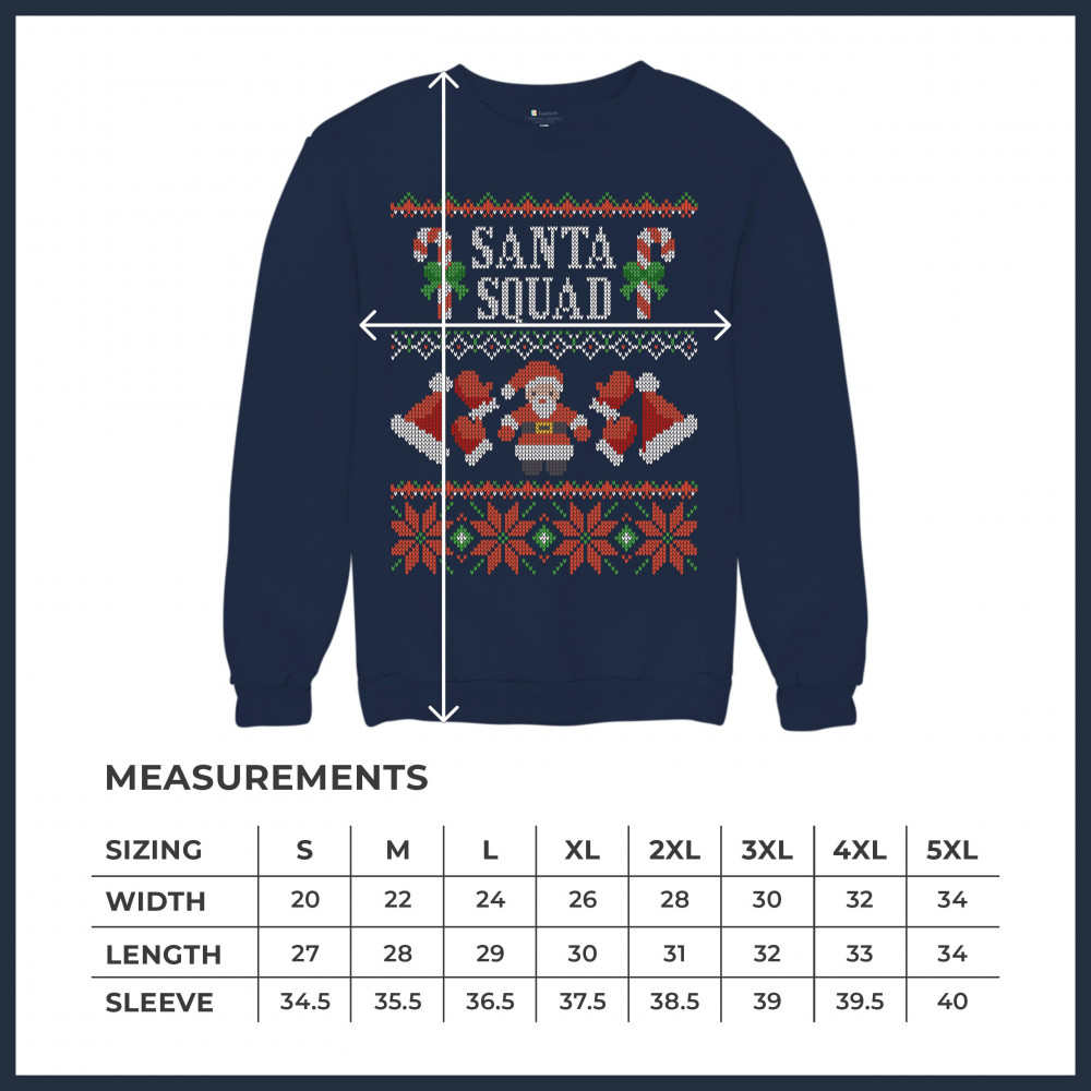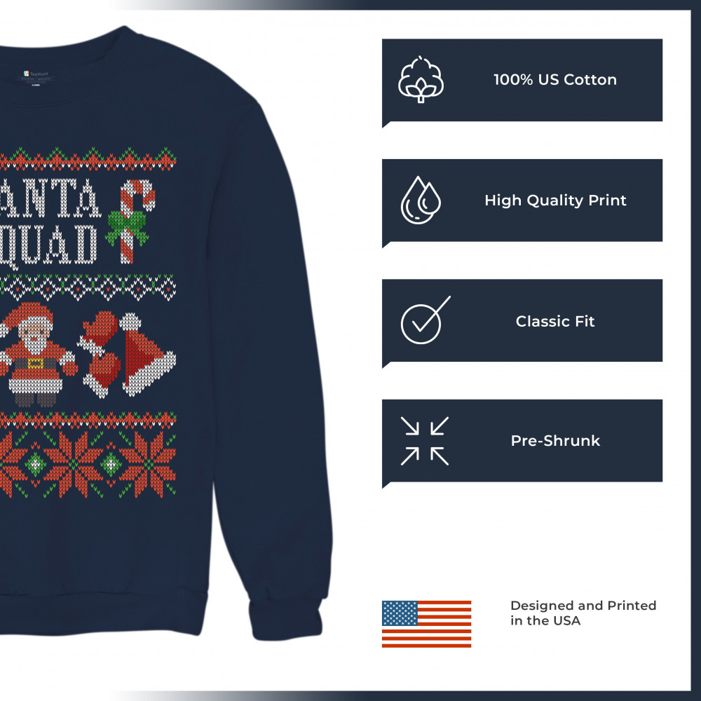 A cute print saying: "Santa Squad" and featuring 2 candy canes, 2 Christmas hats and 4 gloves. The print is decorated as an ugly sweater. Amazing choice to make people smile and spread positive vibes on Christmas Eve.