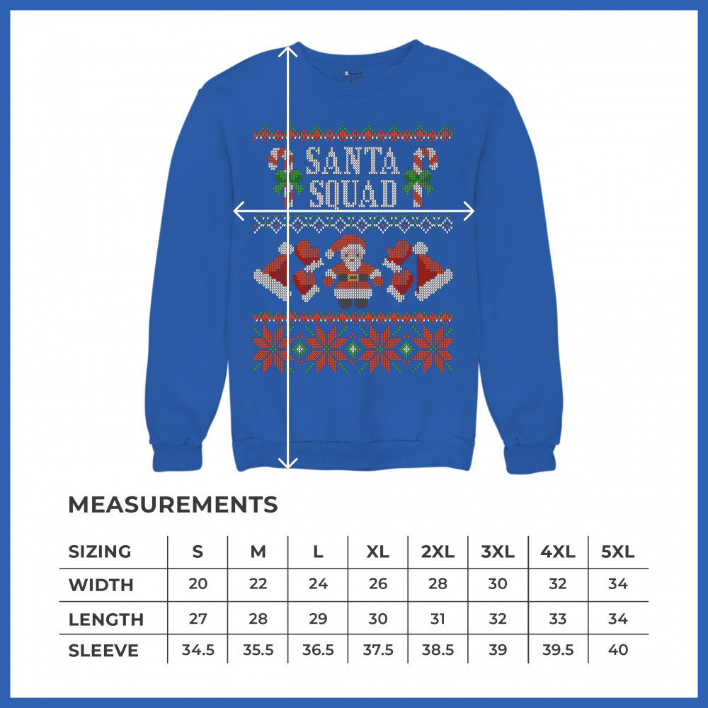 A cute print saying: "Santa Squad" and featuring 2 candy canes, 2 Christmas hats and 4 gloves. The print is decorated as an ugly sweater. Amazing choice to make people smile and spread positive vibes on Christmas Eve.