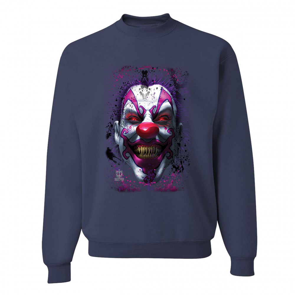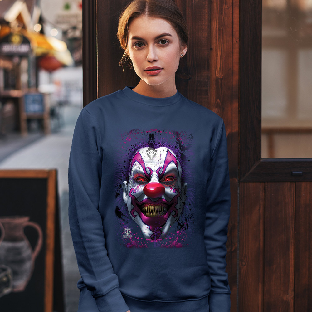 SCARY CREEPY GRINNING CLOWN sweatshirt spooky halloween horror crewneck navy blue