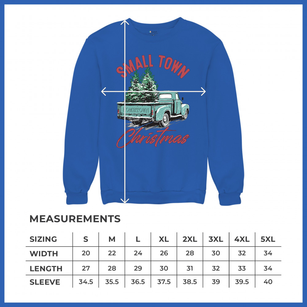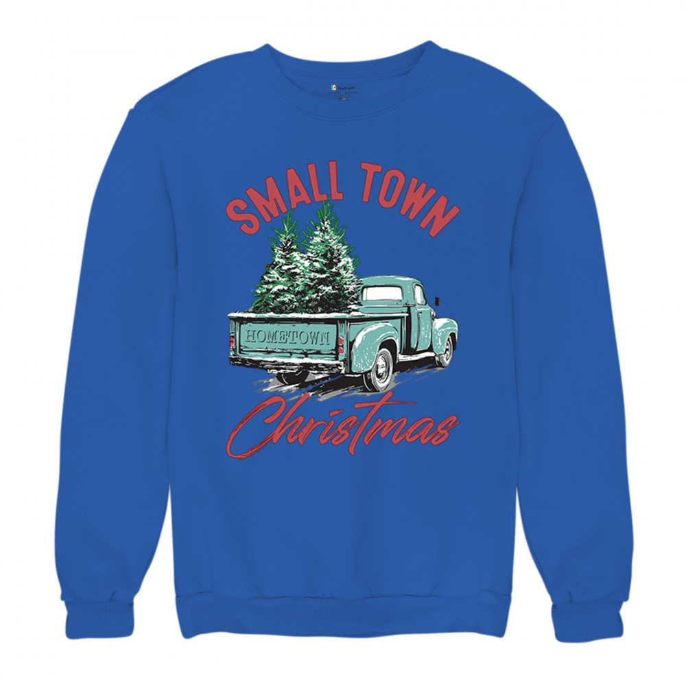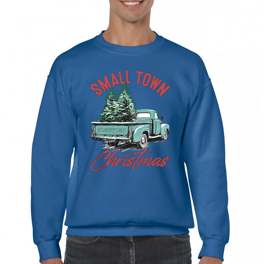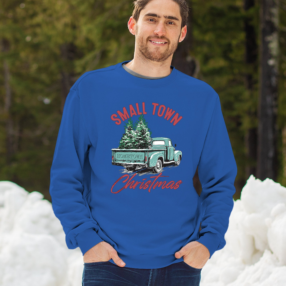Embrace holiday nostalgia with this "Small Town Christmas" design featuring a vintage truck and Christmas trees. Perfect for rustic decor lovers.