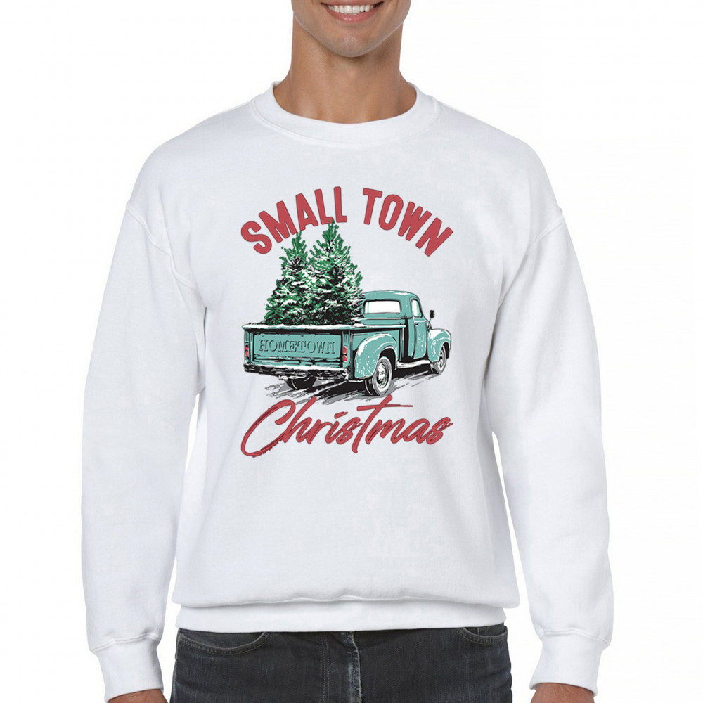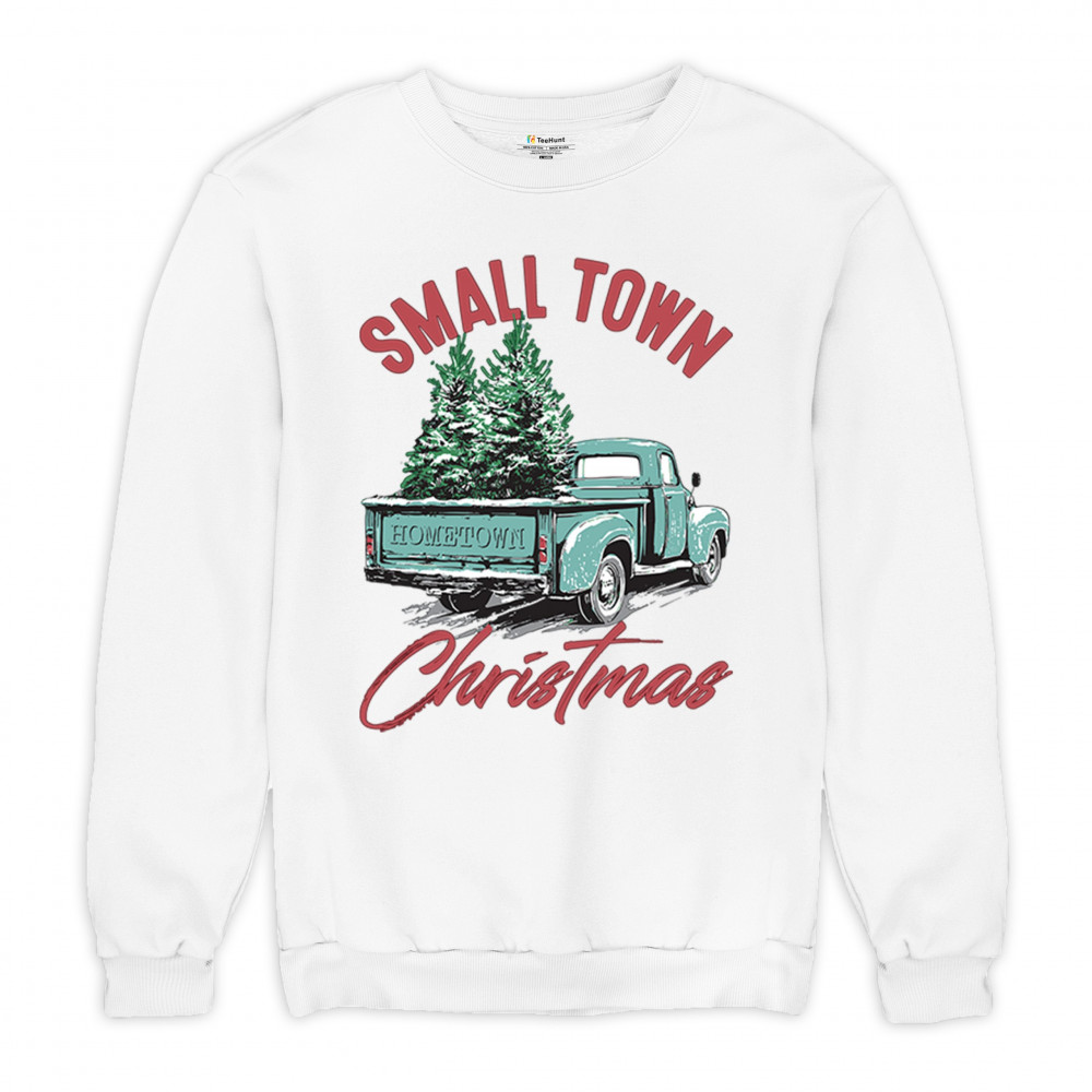 Embrace holiday nostalgia with this "Small Town Christmas" design featuring a vintage truck and Christmas trees. Perfect for rustic decor lovers.