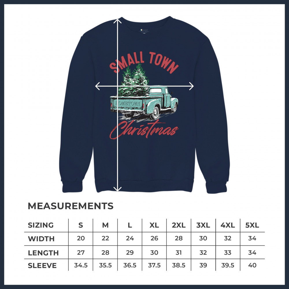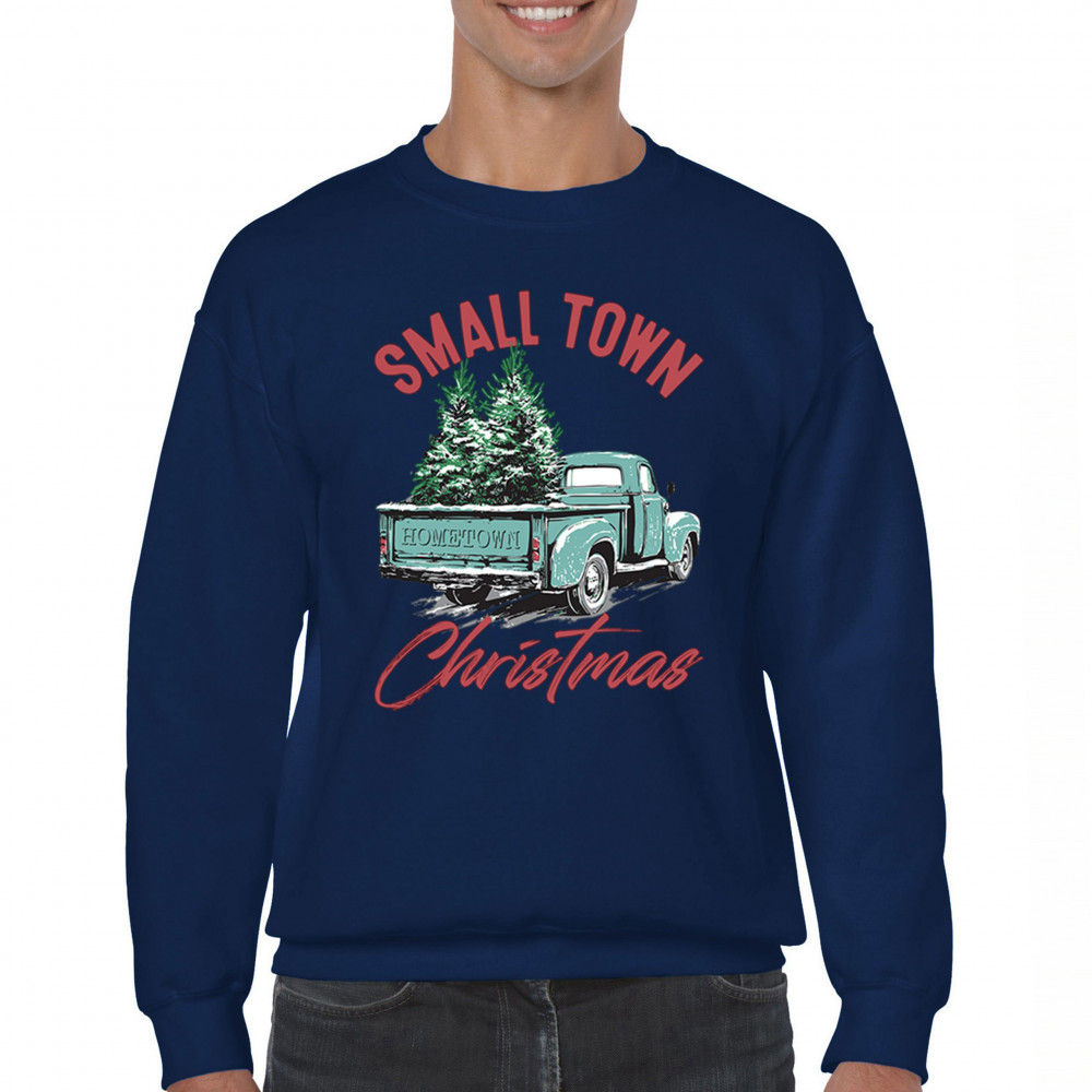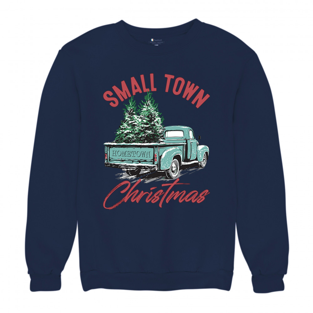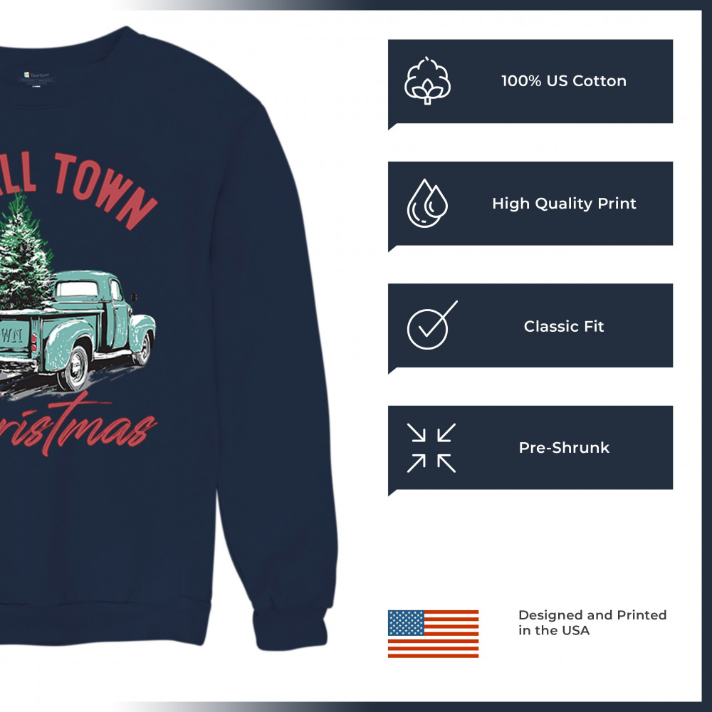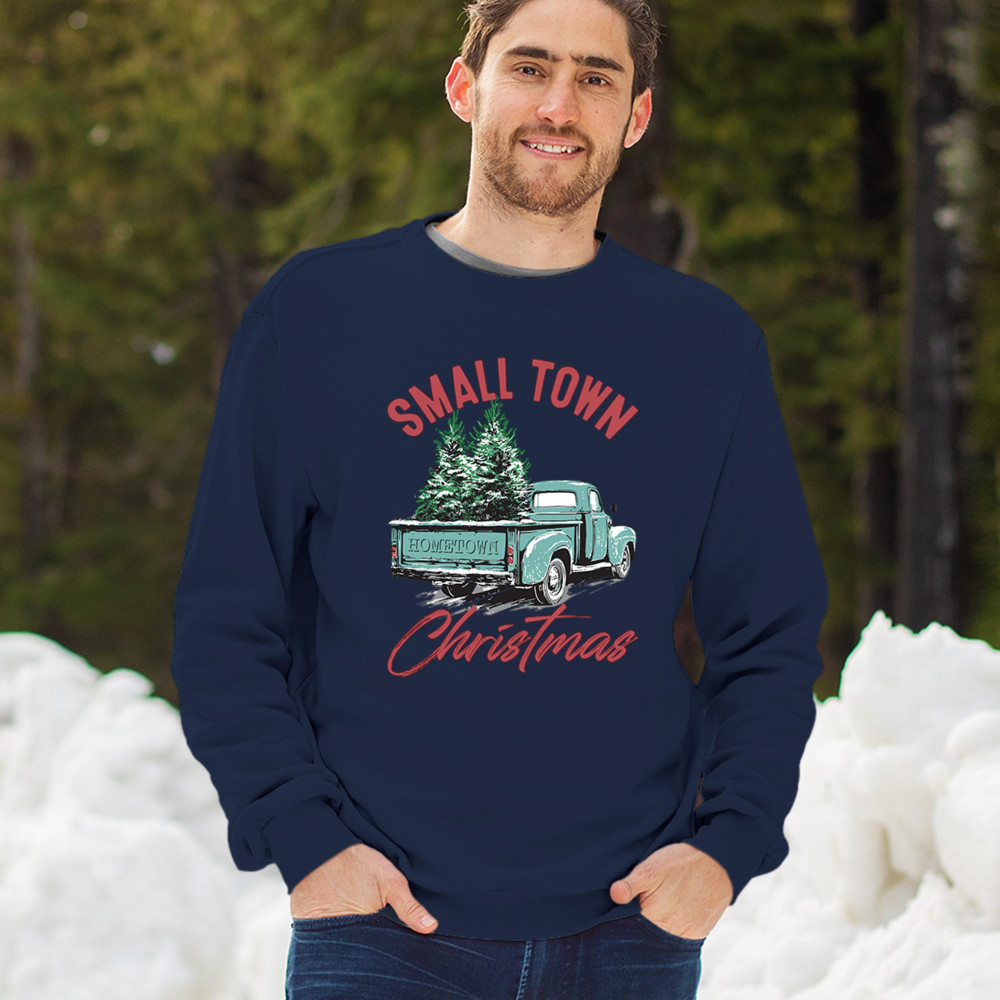 Embrace holiday nostalgia with this "Small Town Christmas" design featuring a vintage truck and Christmas trees. Perfect for rustic decor lovers.