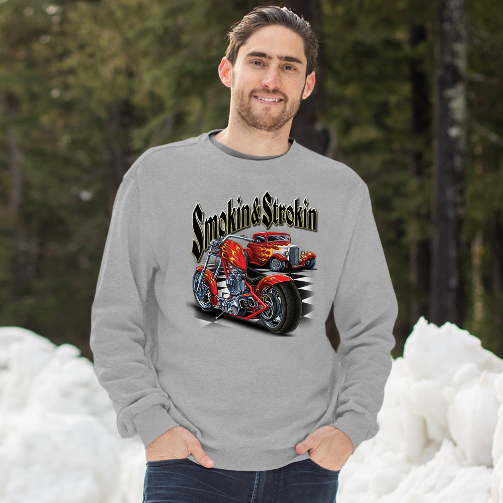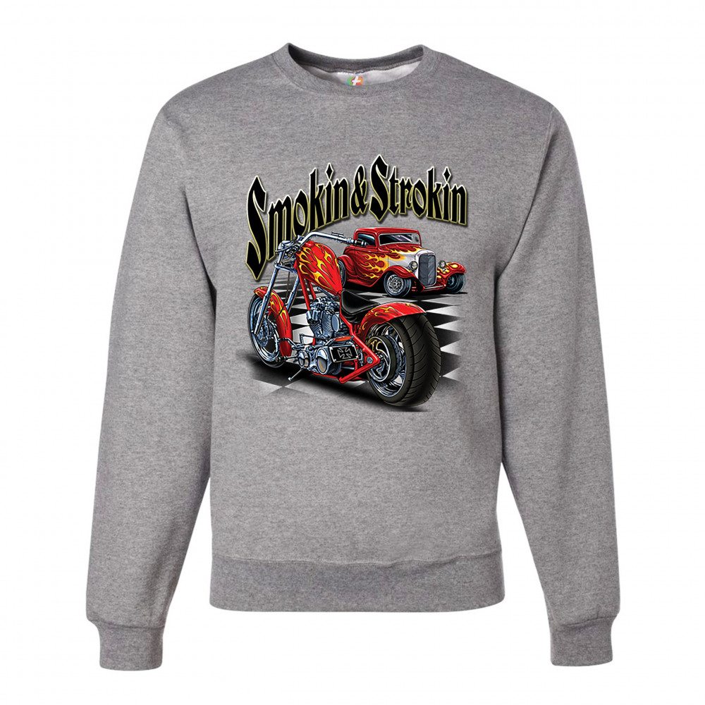 A print featuring a hot rod and a chopper motorcycle standing on a chess board, both covered with flame paint jobs. The print says: "Smoking & Strokin". A great choice for a fan of customized American classic cars, hot rods and motorcycles.