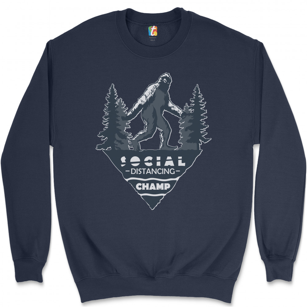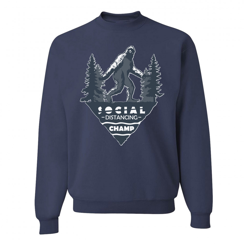 SOCIAL DISTANCING CHAMP sweatshirt funny bigfoot yeti virus quarantine crewneck navy blue
