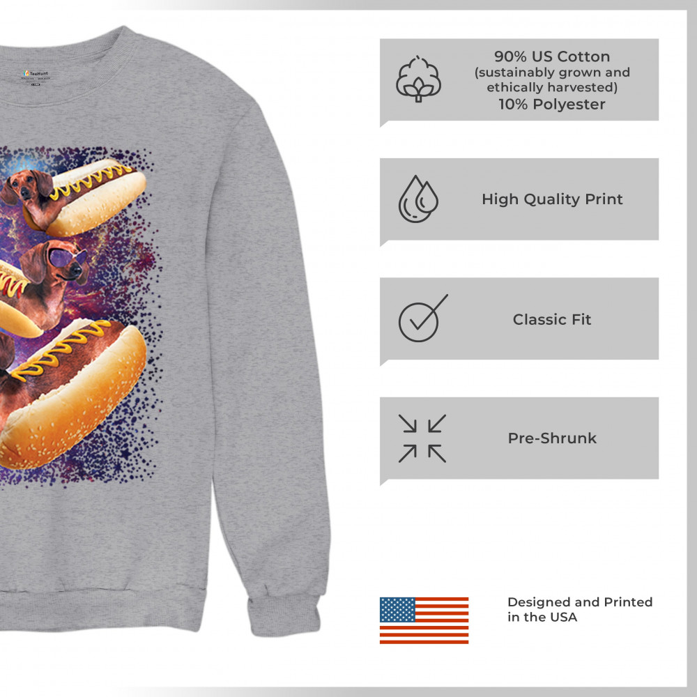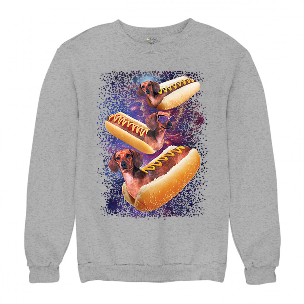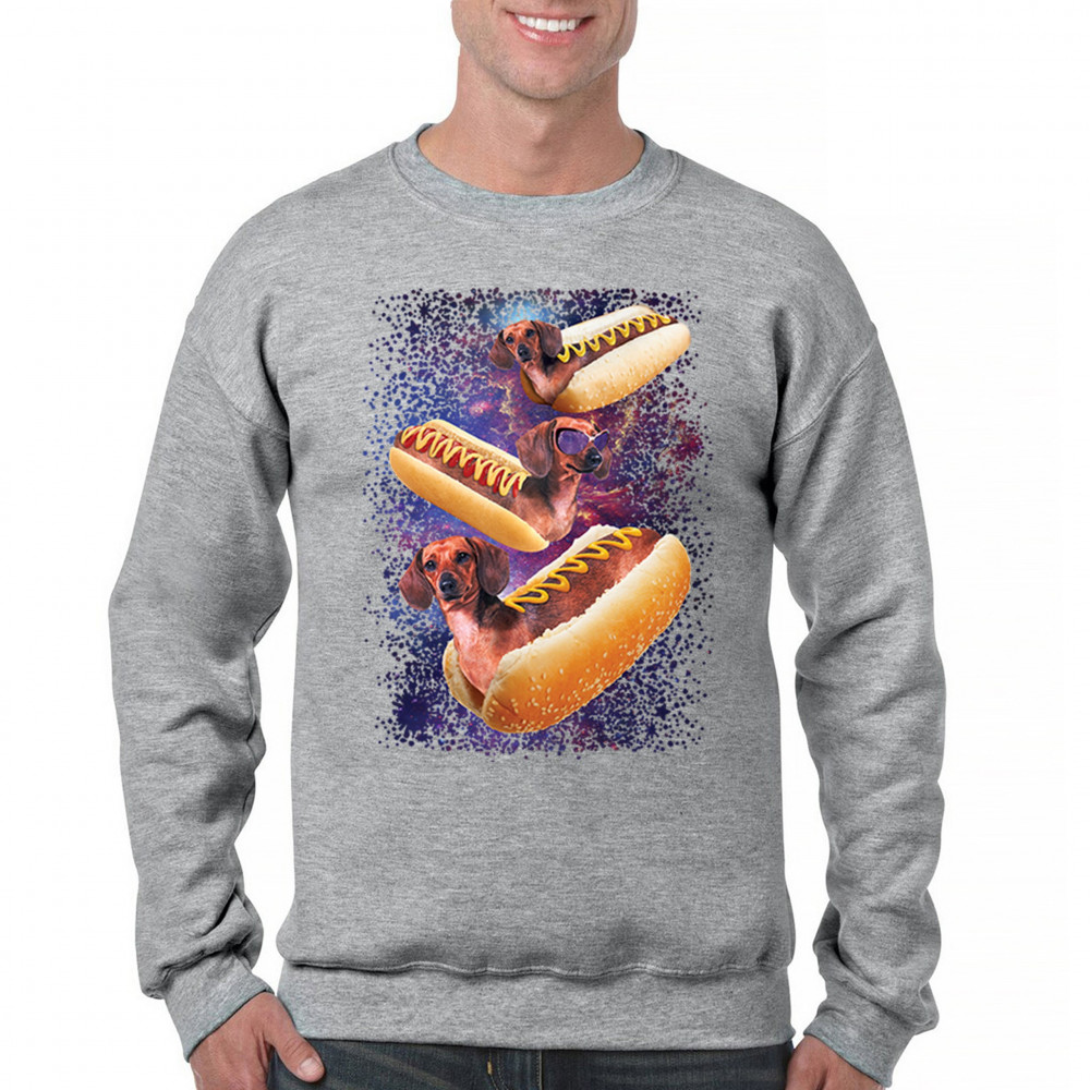 Quirky and fun tee featuring dachshunds as hotdogs in a cosmic setting. Perfect for dog and space lovers. Comfortable and durable.