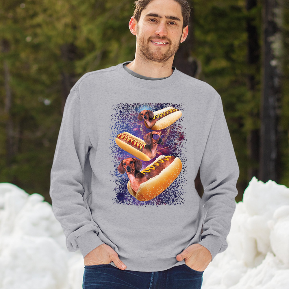 Add a dash of humor to your wardrobe with our unique design featuring adorable dachshunds as hotdogs in a cosmic setting. This playful graphic is perfect for animal lovers and those with a quirky sense of style. The vibrant colors and detailed illustration ensure you stand out in any crowd. Made from premium materials, this tee offers both comfort and durability, making it ideal for everyday wear or special occasions. Embrace your love for dogs and space with this fun and imaginative design.