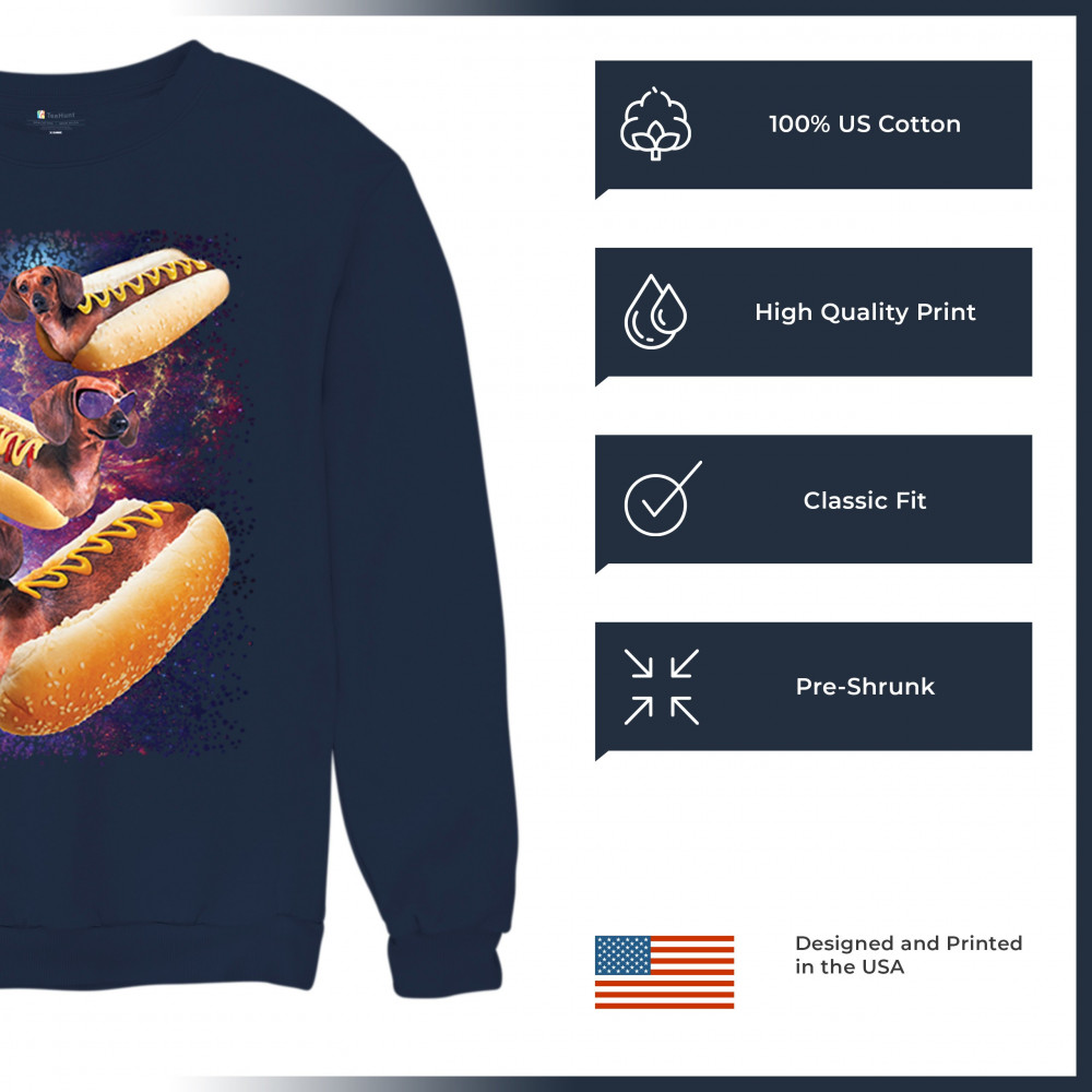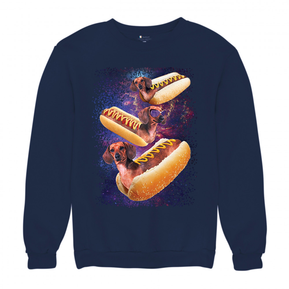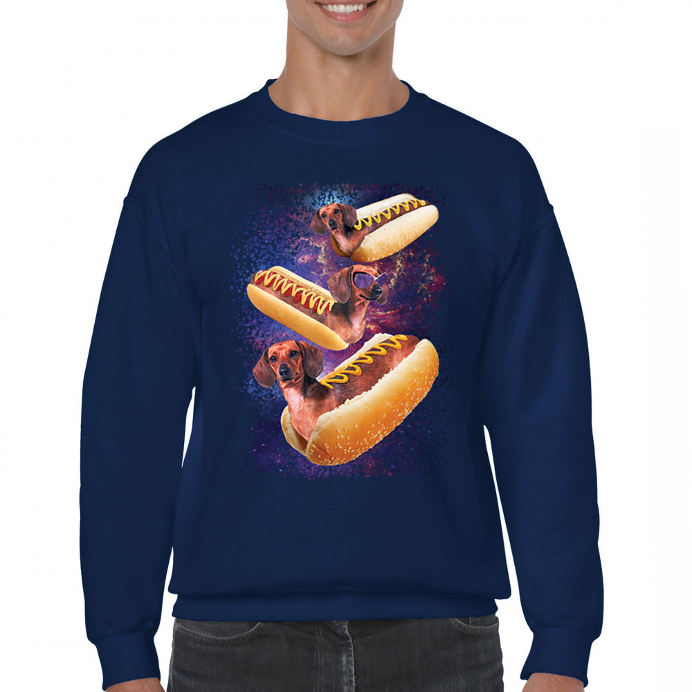 Quirky and fun tee featuring dachshunds as hotdogs in a cosmic setting. Perfect for dog and space lovers. Comfortable and durable.